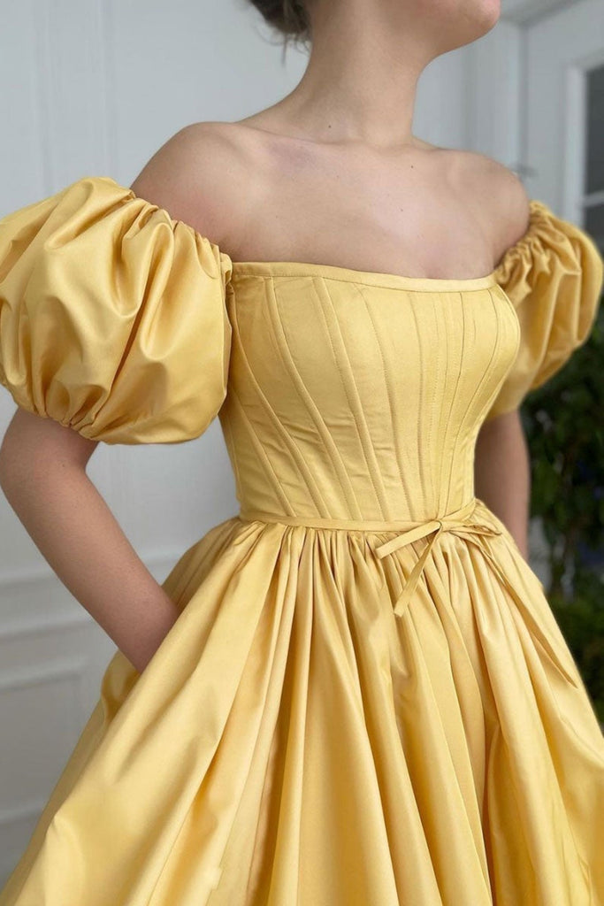 Lantern Sleeve High Slit Yellow Long Prom Dresses with Pocket, Lantern Sleeve Yellow Formal Evening Dresses