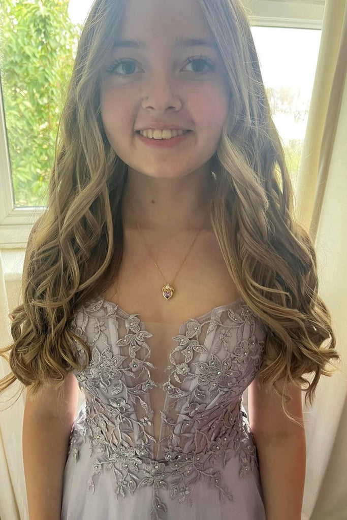 Lavender Tulle A Line V Neck Lace Long Prom Dresses, Lavender Lace Formal Graduation Evening Dresses WT1717