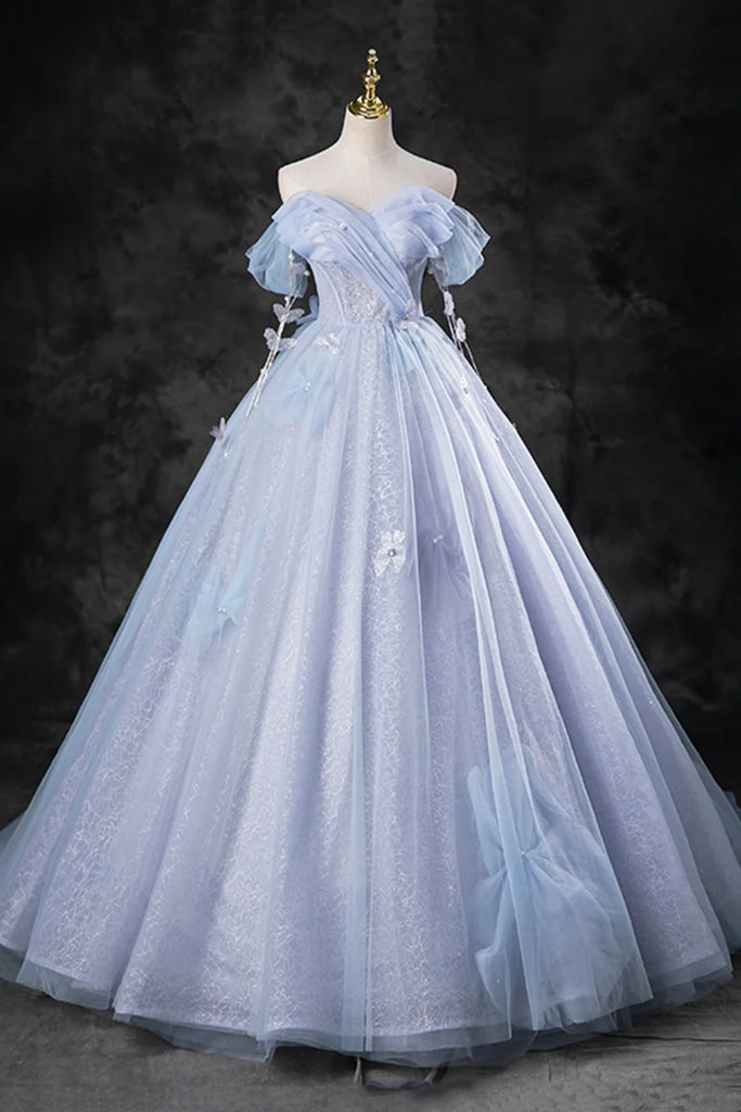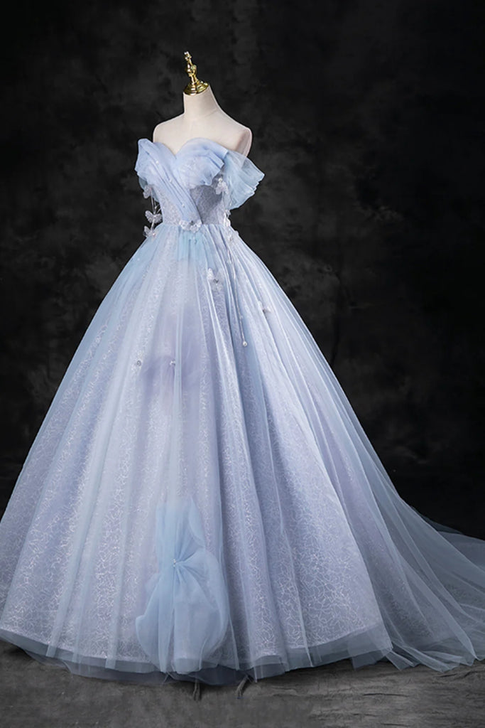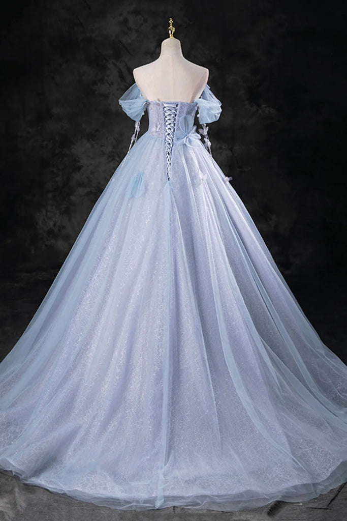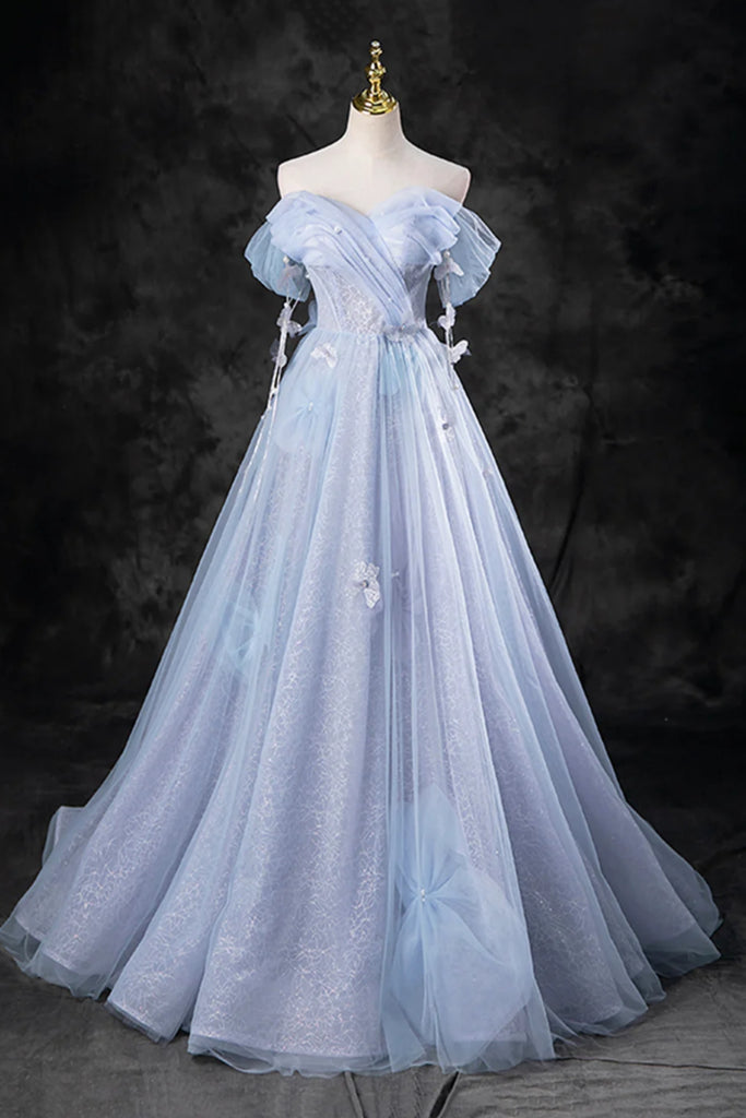 Light Blue Tulle Floral Off Shoulder Long Prom Dresses, Off the Shoulder Blue Formal Evening Dresses WT1561