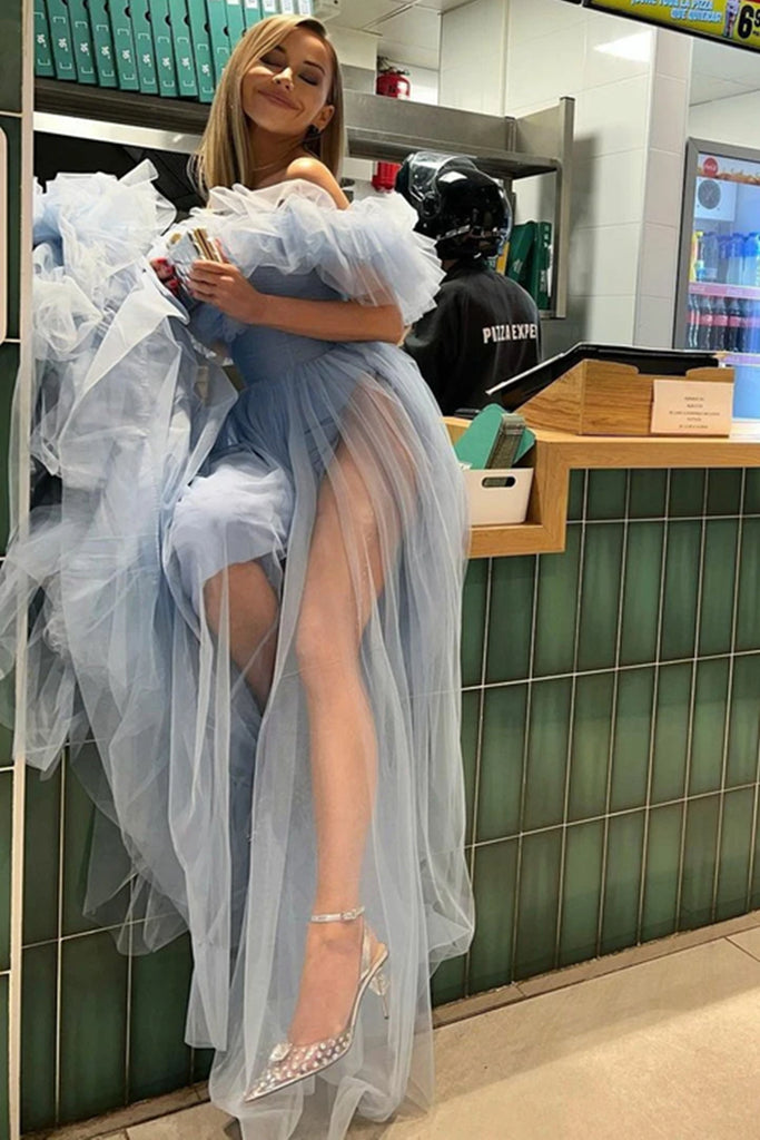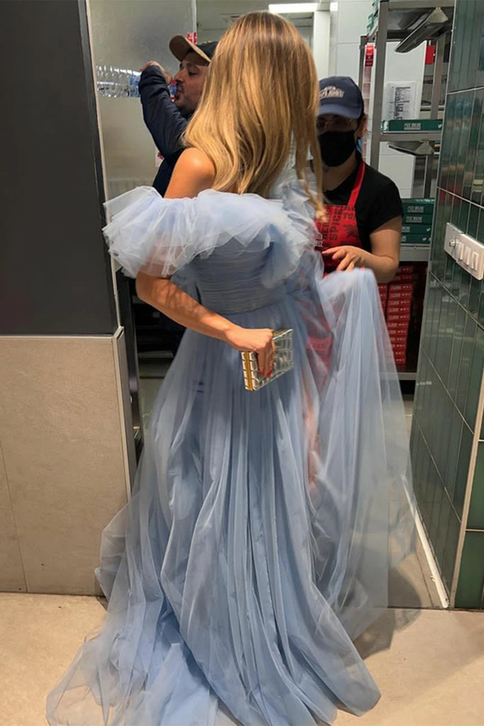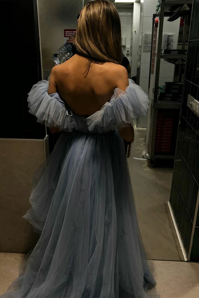 Light Blue Tulle Off Shoulder Long Prom Dresses, Off the Shoulder Formal Dresses, Blue Evening Dresses WT1169