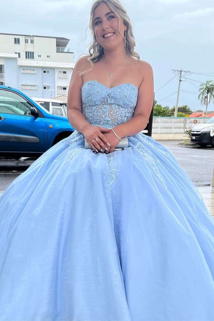 Light Blue Tulle Sweetheart Neck Strapless Lace Long Prom Dresses, Light Blue Lace Formal Graduation Evening Dresses WT1117