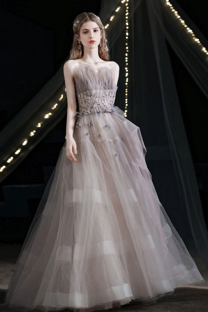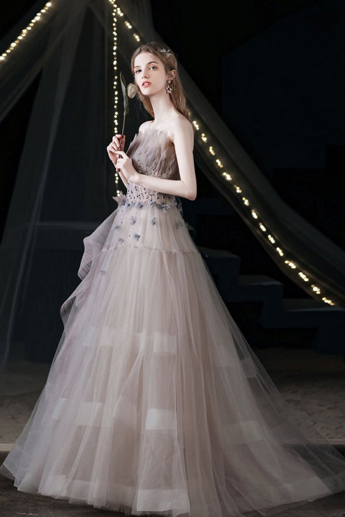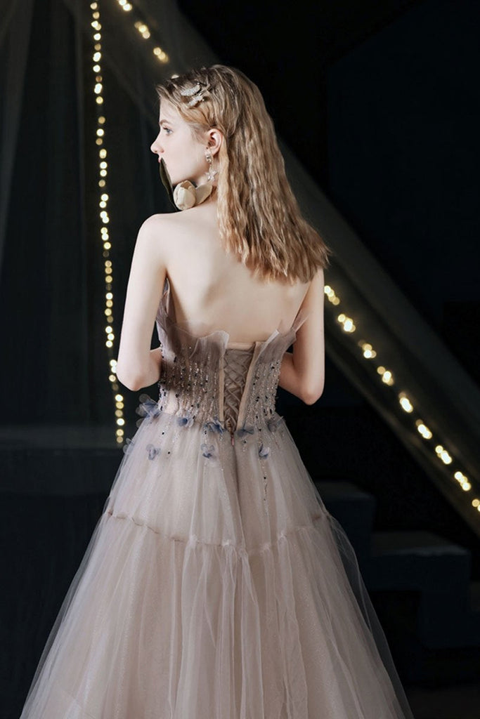 Light Champagne Tulle Long Prom Dresses with Sequins, Long Champagne Formal Evening Dresses