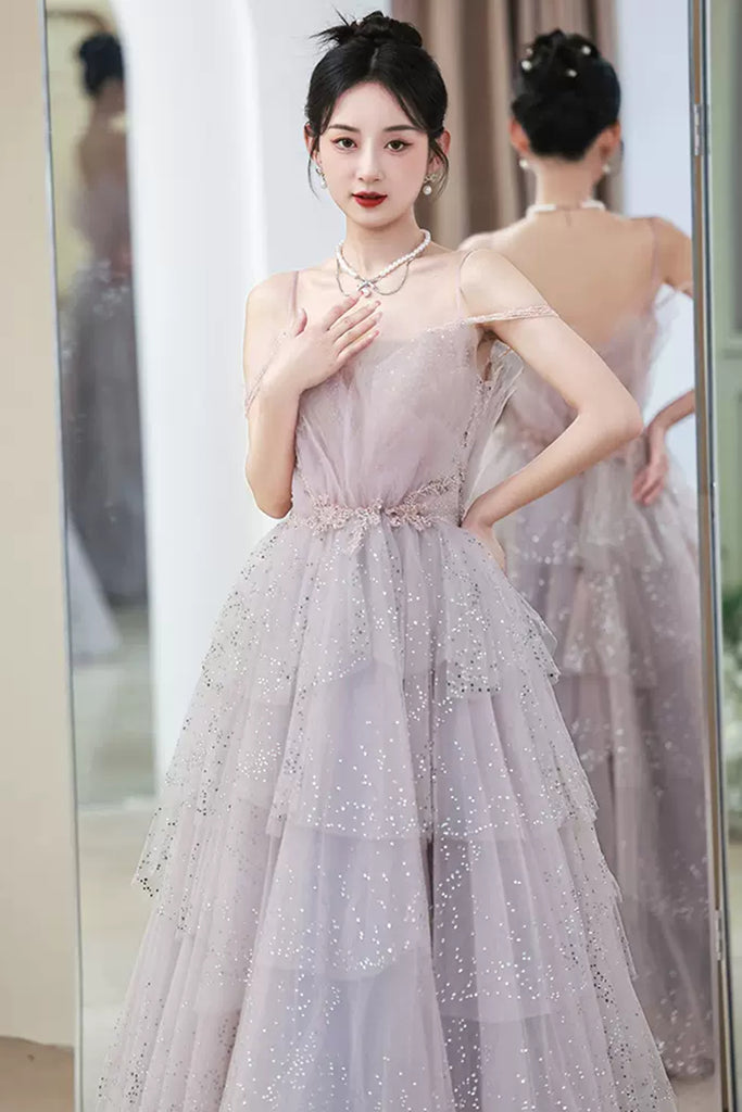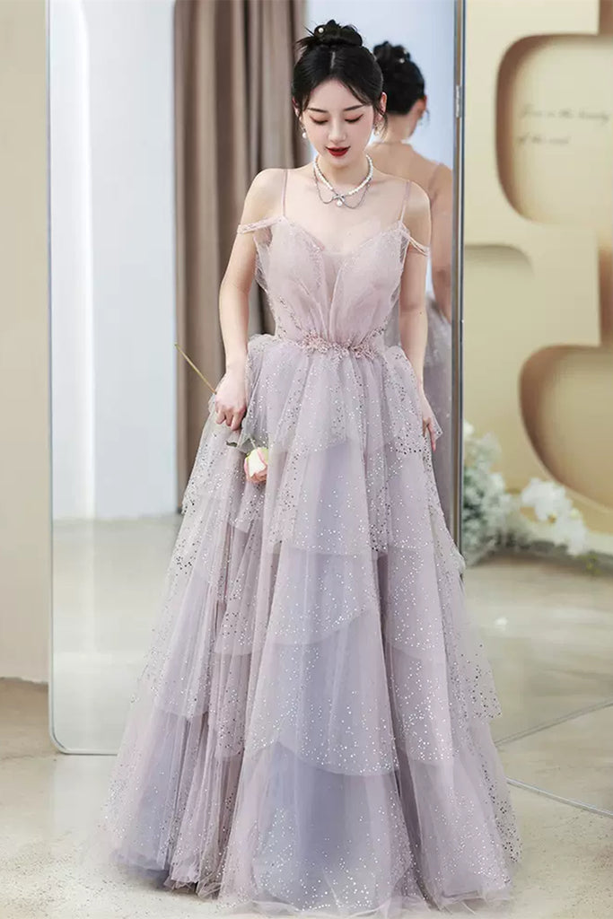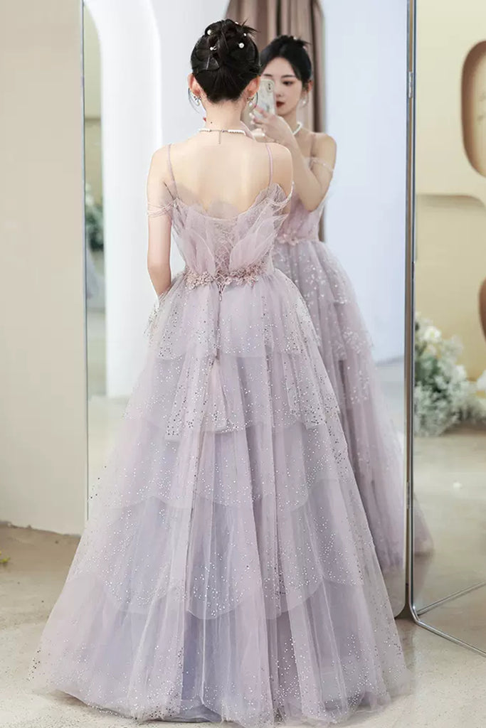 Light Purple Tulle V Neck Long Prom Dresses with Belt, Light Purple Formal Dresses, Evening Dresses WT1192