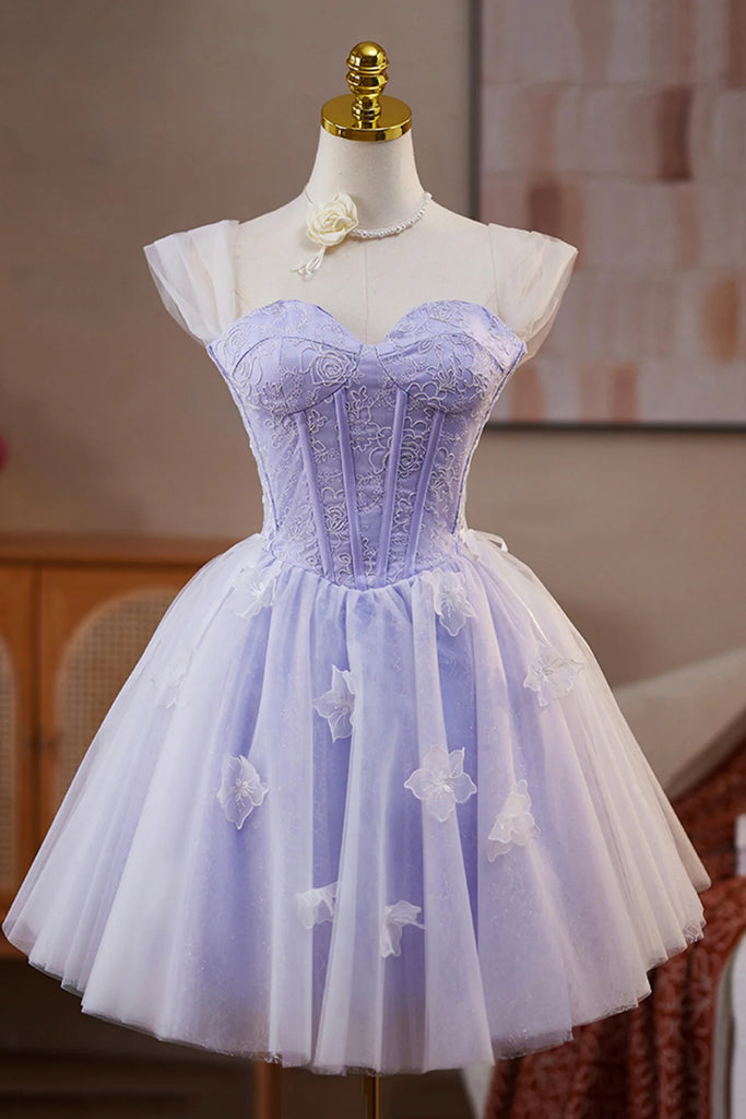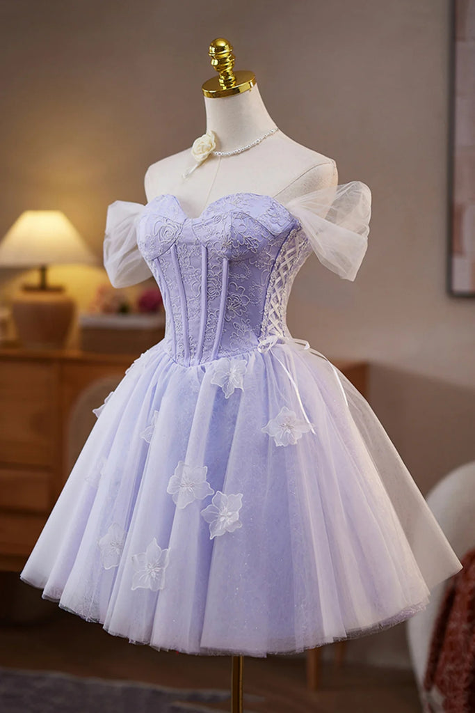 Lilac Tulle Off the Shoulder Lace Short Prom Dresses, Lilac Lace Homecoming Dresses, Lilac Formal Graduation Evening Dresses WT1647