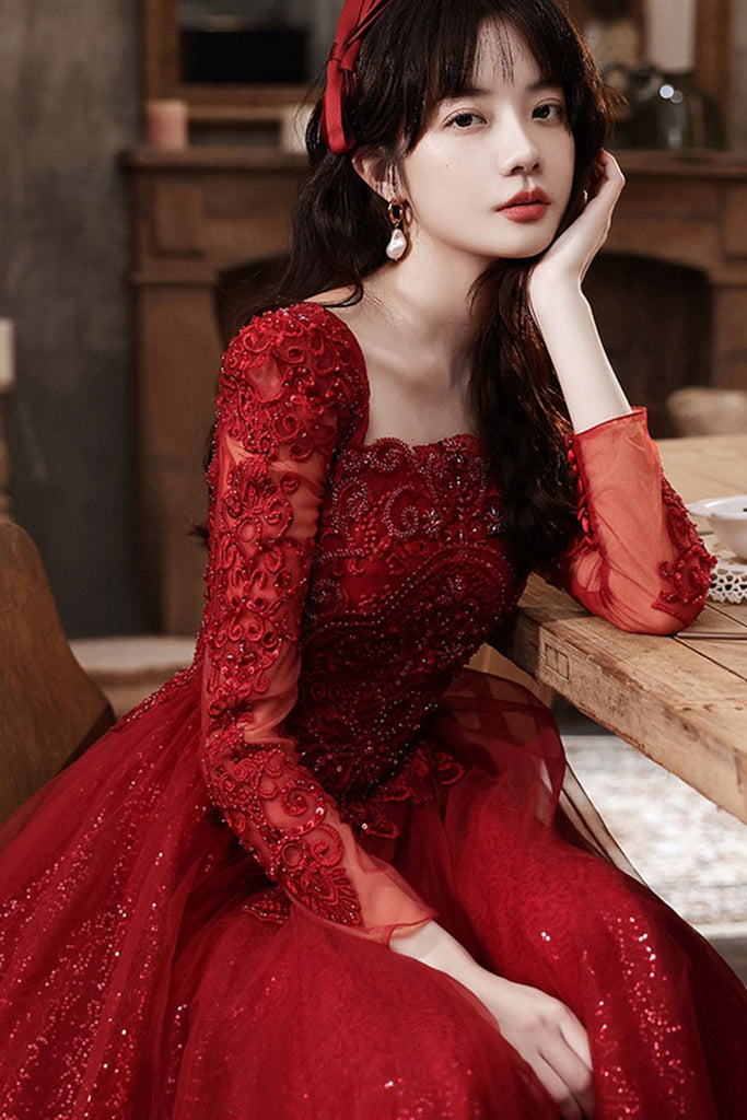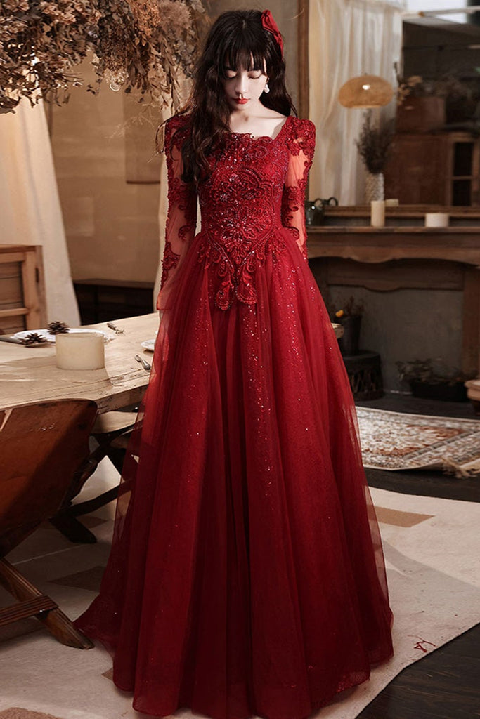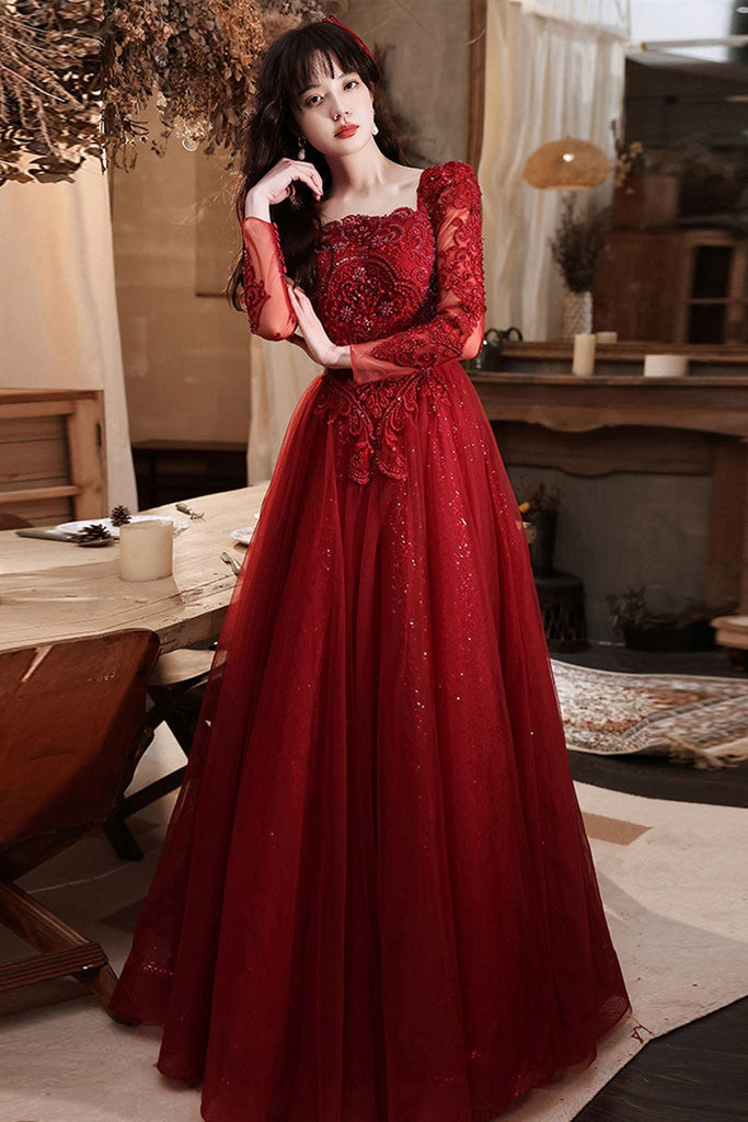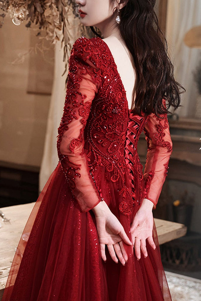 Long Sleeves Burgundy Lace Long Prom Dresses, Burgundy Lace Formal Dresses, Burgundy Evening Dresses