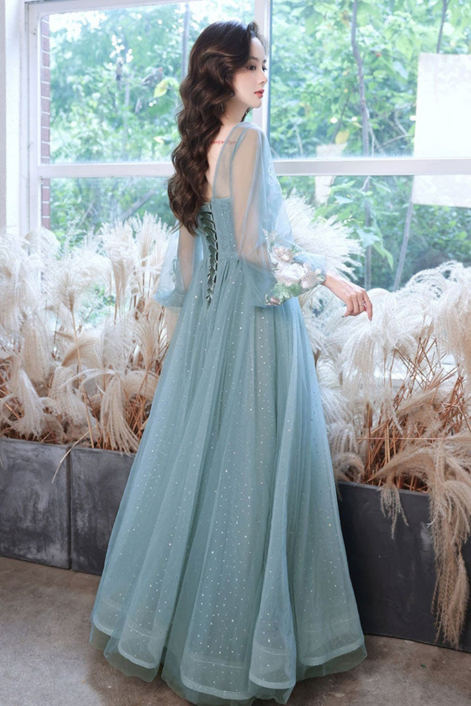 Long Sleeves Green Tulle Long Prom Dresses with Appliques, Long Sleeves Green Formal Dresses, Long Green Evening Dresses