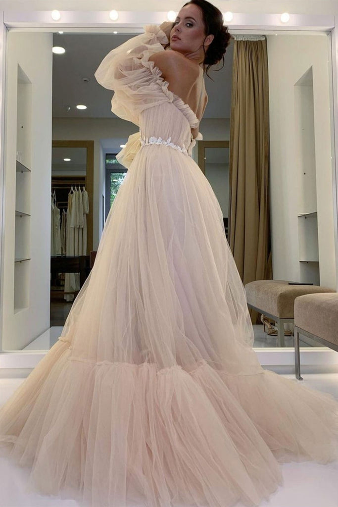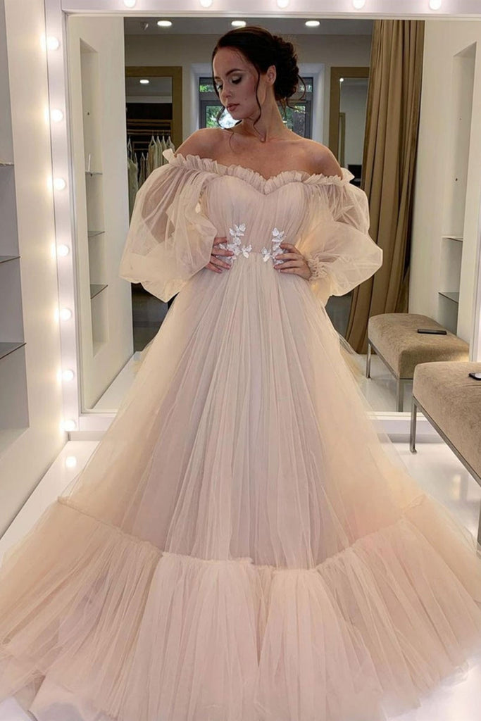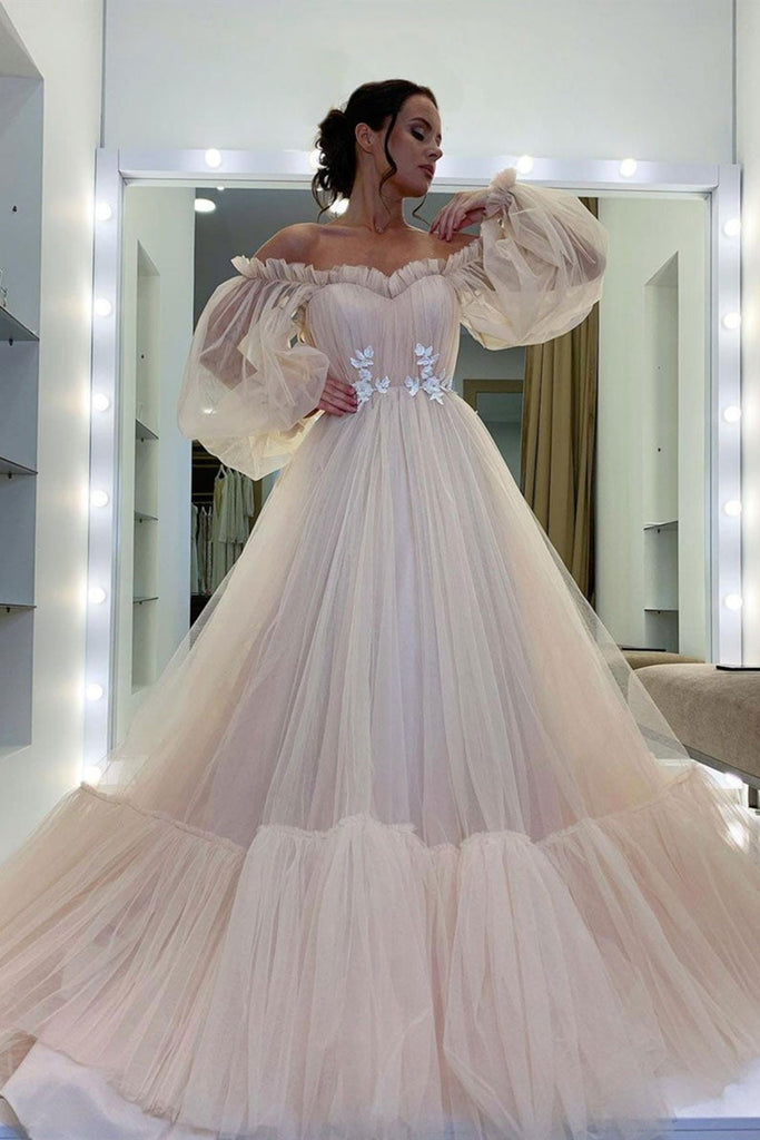 Long Sleeves Pink Tulle Long Prom Dresses, Long Pink Formal Dresses, Long Sleeves Pink Evening Dresses