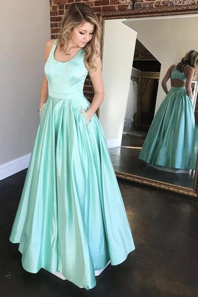 Mint Green Satin Long Prom Dresses Round Neck Mint Green Formal Graduation Evening Dresses with Pocket