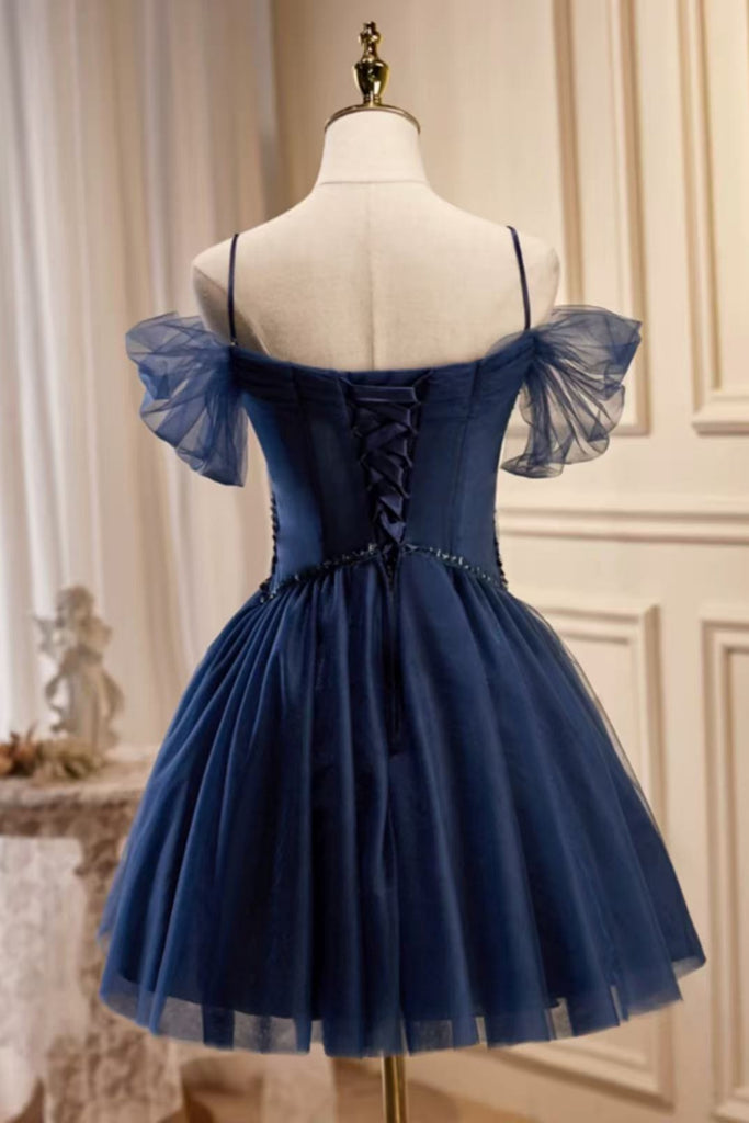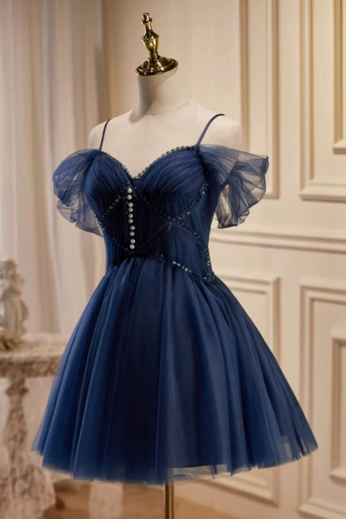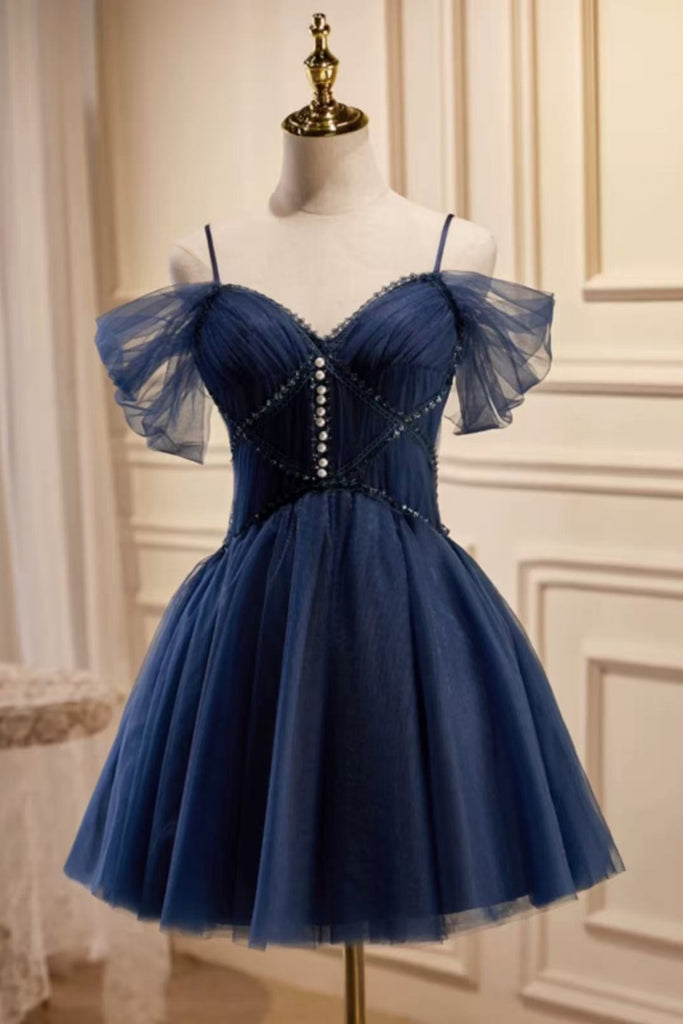 Navy Blue Tulle Cute Off the Shoulder Short Prom Dresses with Pearls, Off Shoulder Navy Blue Homecoming Dresses, Blue Formal Graduation Evening Dresses WT1640