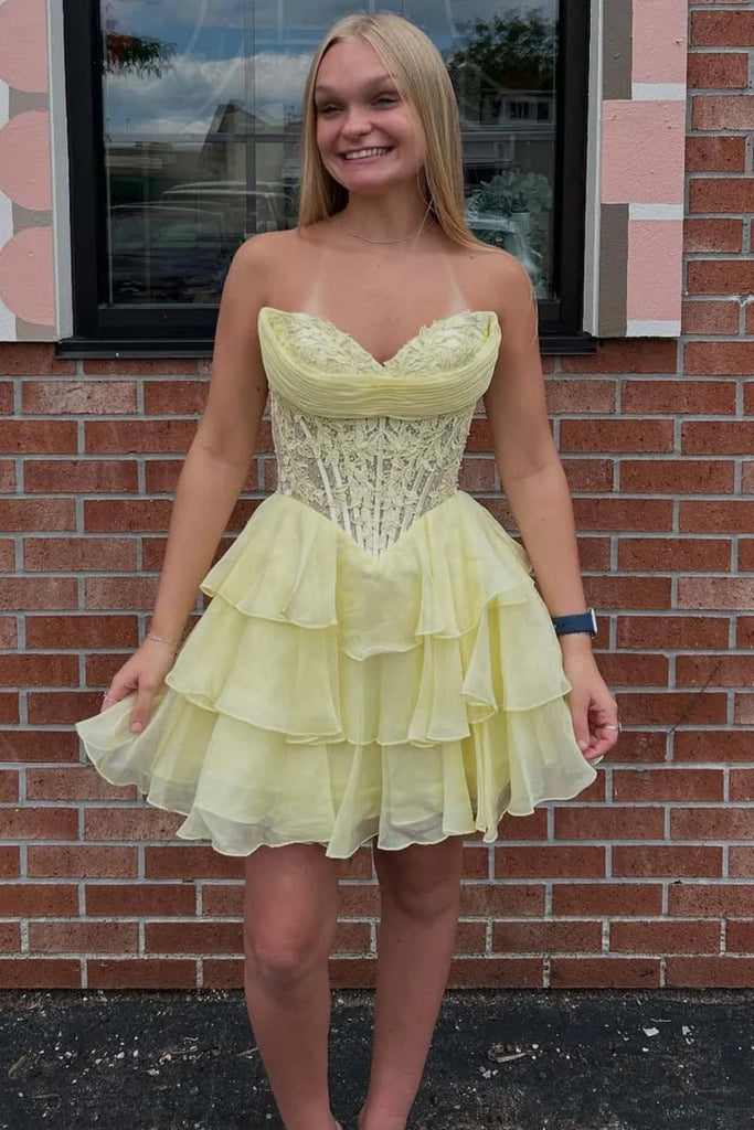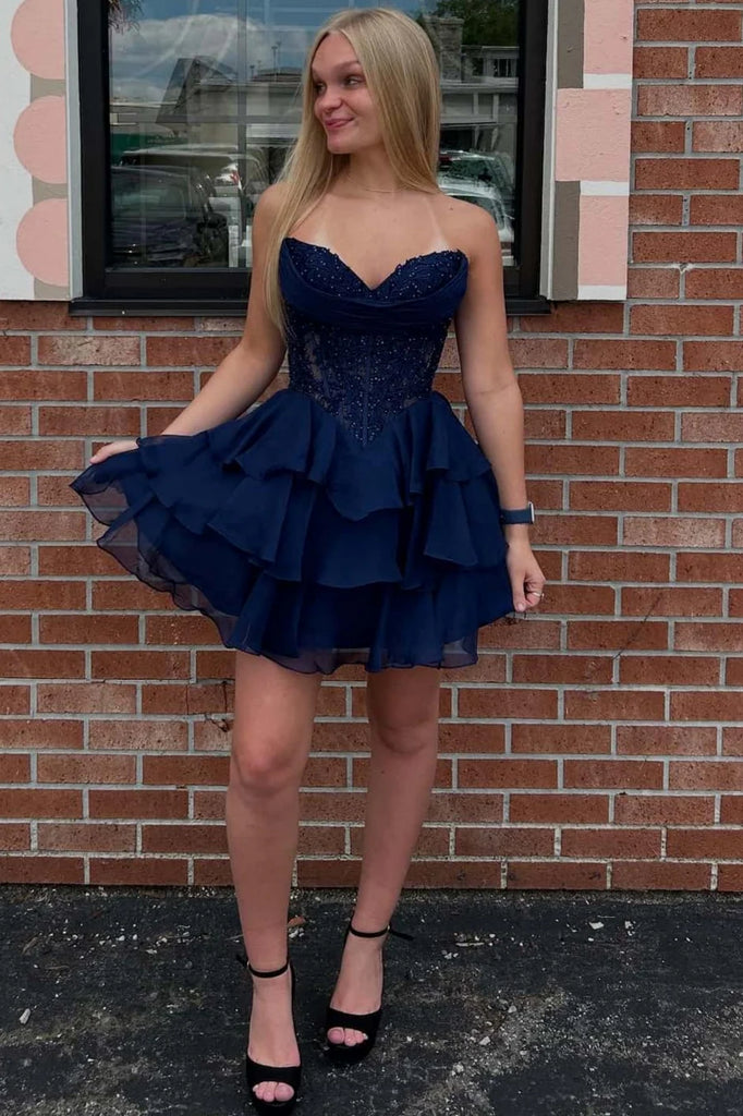 Navy Blue/Yellow A Line Strapless Layered Lace Short Prom Dresses, Navy Blue/Yellow Lace Homecoming Dresses WT1665