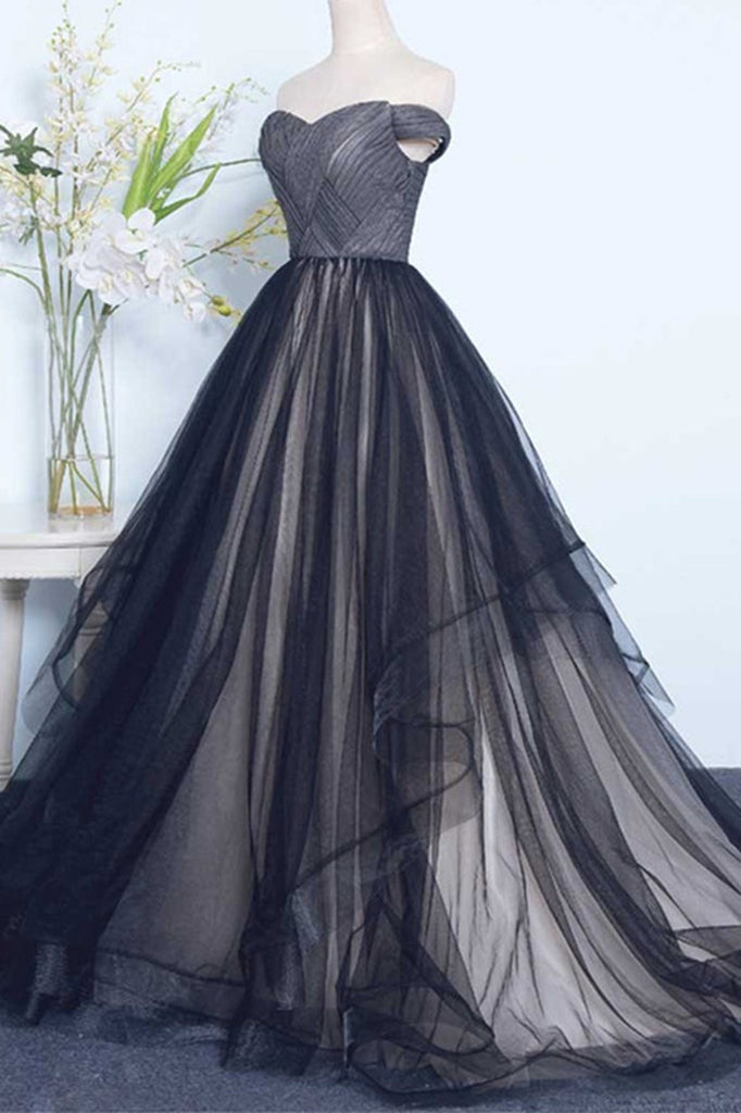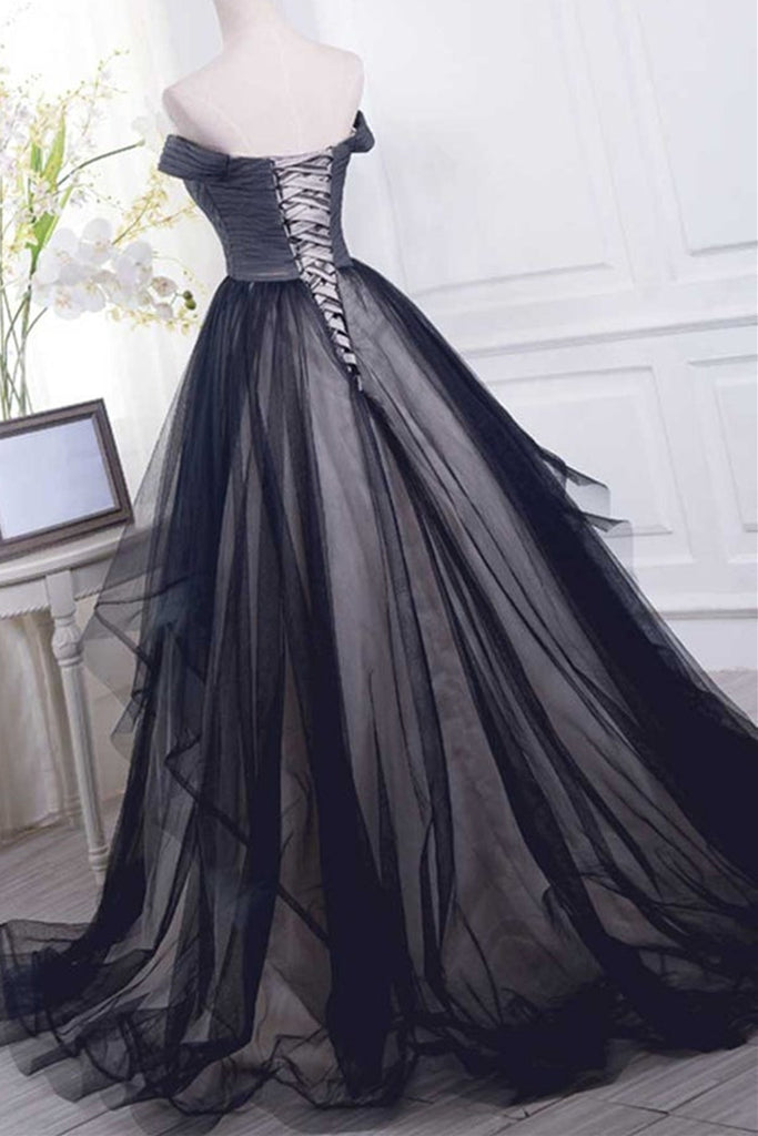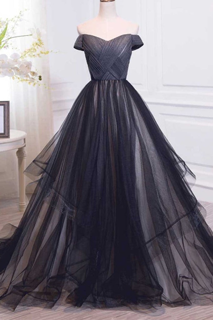 Off Shoulder Black Tulle Long Prom Dresses, Off the Shoulder Black Formal Dresses, Black Evening Dresses