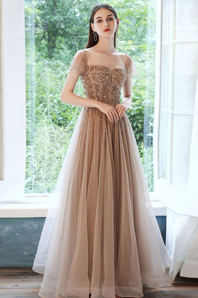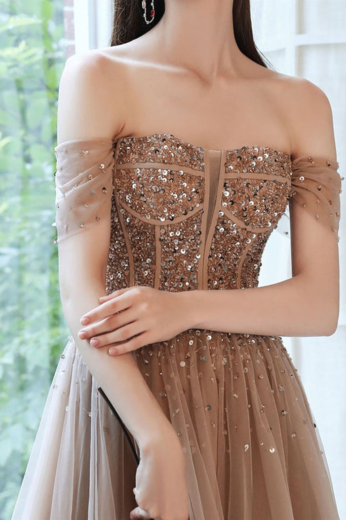 Off Shoulder Champagne Sequins Long Prom Dresses, Champagne Sequins Formal Evening Dresses