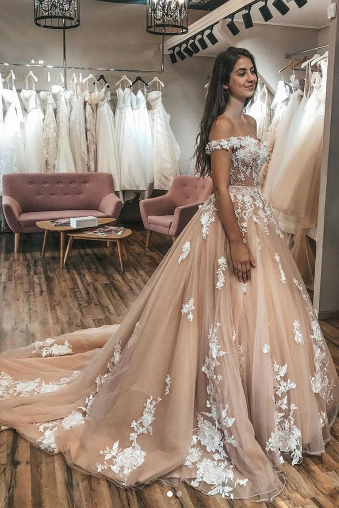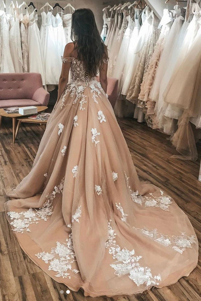 Off Shoulder Champagne Tulle Lace Long Prom Dresses with Train, Off the Shoulder Champagne Formal Evening Dresses