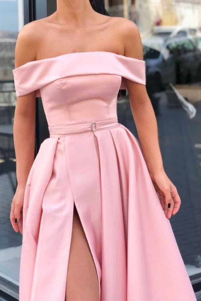 Off Shoulder Pink Satin Long Prom Dresses with High Slit, Off the Shoulder Pink Formal Graduation Evening Dresses