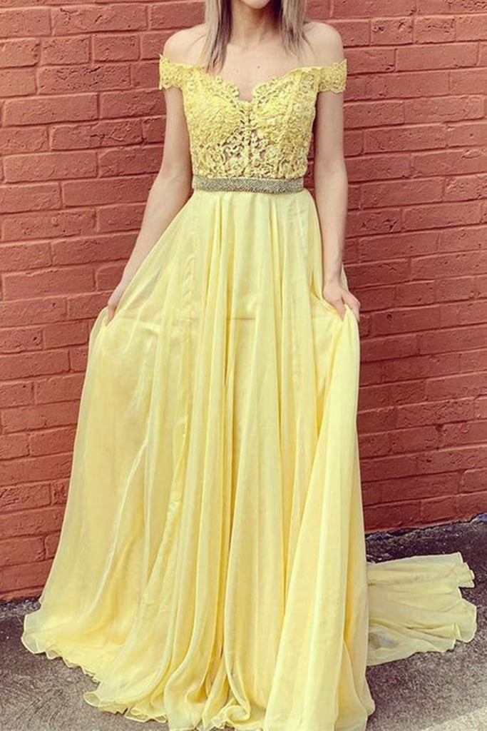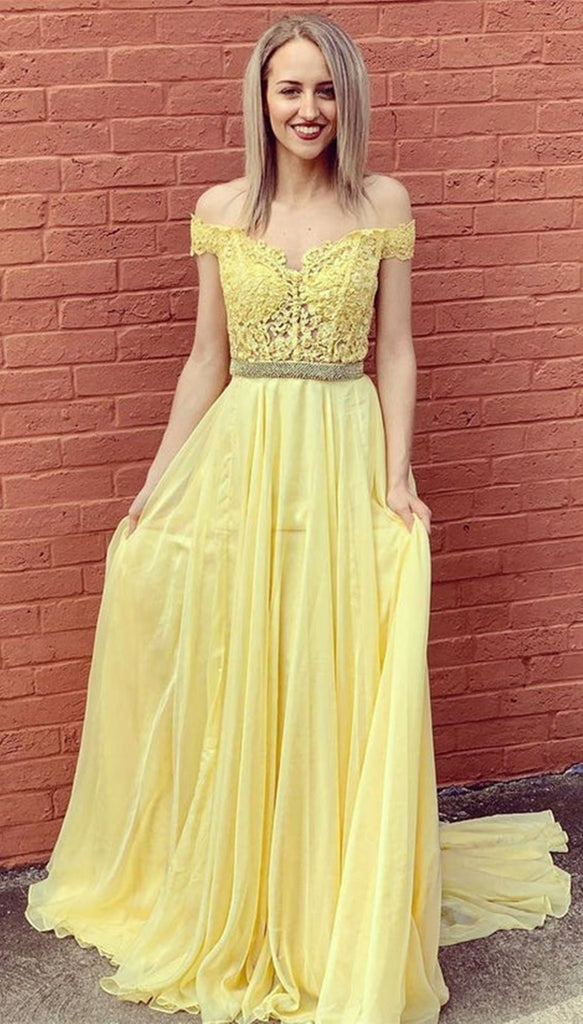 Off Shoulder Yellow Lace Long Prom Dresses with Belt, Yellow Lace Formal Graduation Evening Dresses