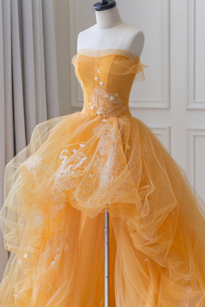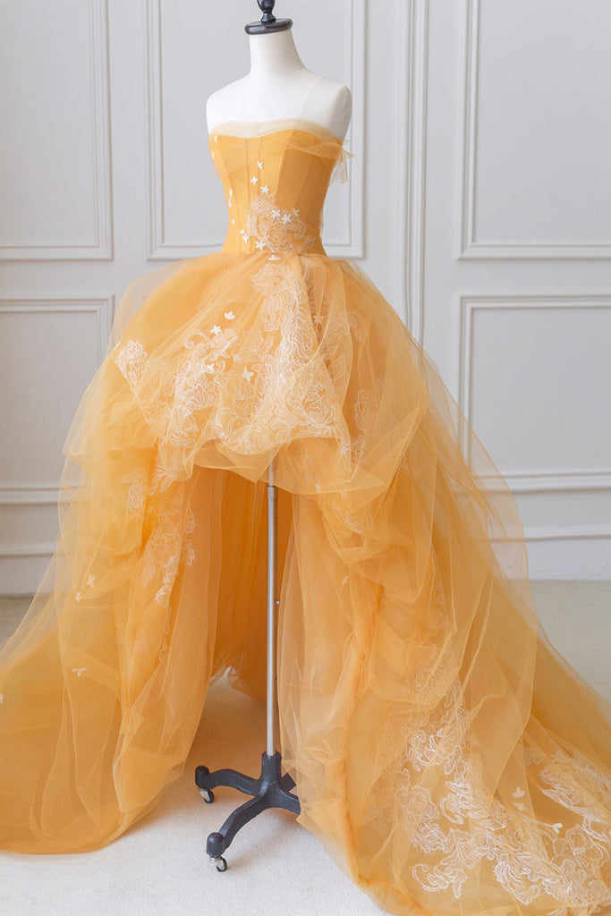 Orange Tulle Strapless High Low Lace Long Prom Dresses, High Low Orange Formal Evening Dresses, Ball Gown WT1145