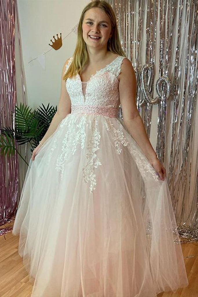 Pink Lace V Neck Long Prom Dresses with Belt, Pink Lace Formal Dresses, Pink Evening Dresses WT1096
