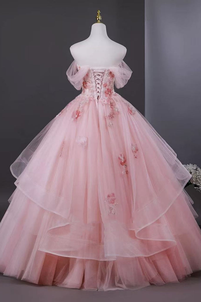 Pink Off the Shoulder Floral Long Prom Dresses, Pink Formal Evening Dresses with Appliques, Pink Ball Gown WT1712