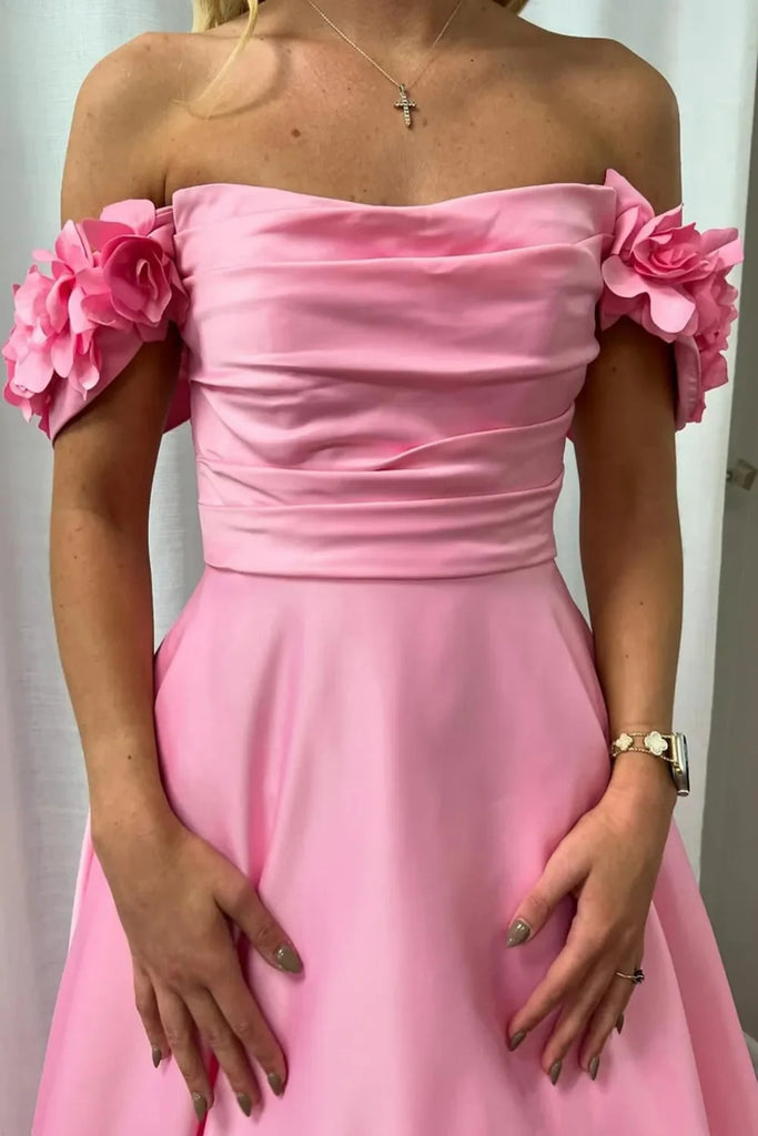 Pink Off the Shoulder Satin Long Prom Dresses with Flowers, Long Pink Formal Graduation Evening Dresses WT1645