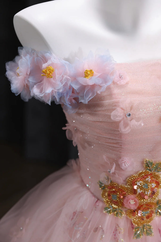Pink Tulle A Line Lace Long Prom Dresses with Appliques, Pink Floral Formal Evening Dresses WT1676
