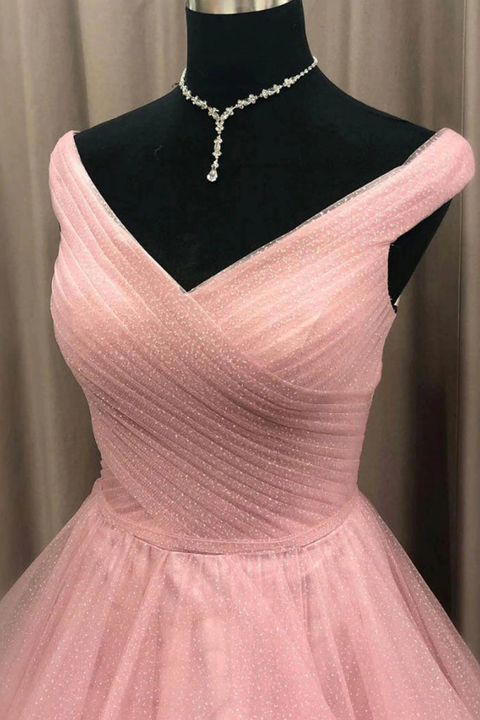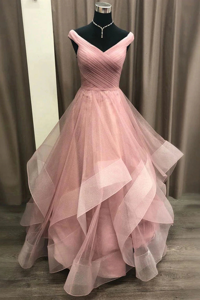 Pink Tulle Long Prom Dresses Off Shoulder Layered Pink Tulle Formal Evening Dresses