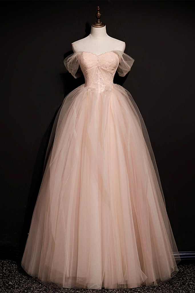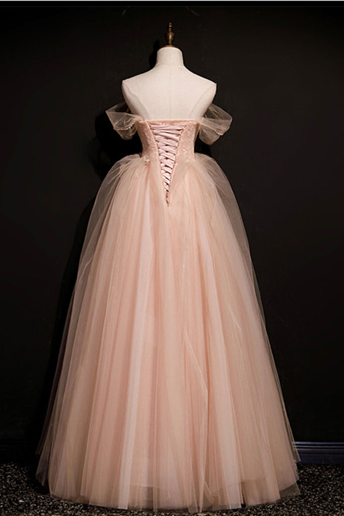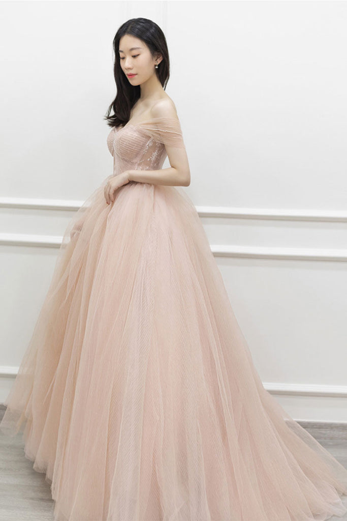 Pink Tulle Off Shoulder Long Prom Dresses, Off the Shoulder Pink Formal Dresses, Pink Lace Evening Dresses WT1053