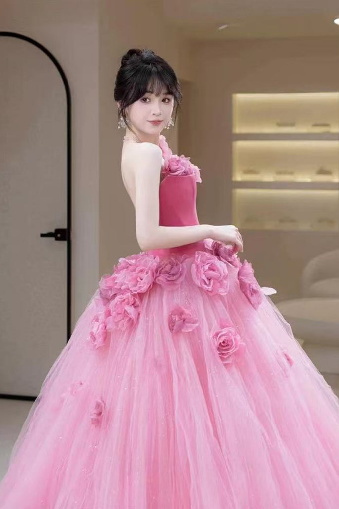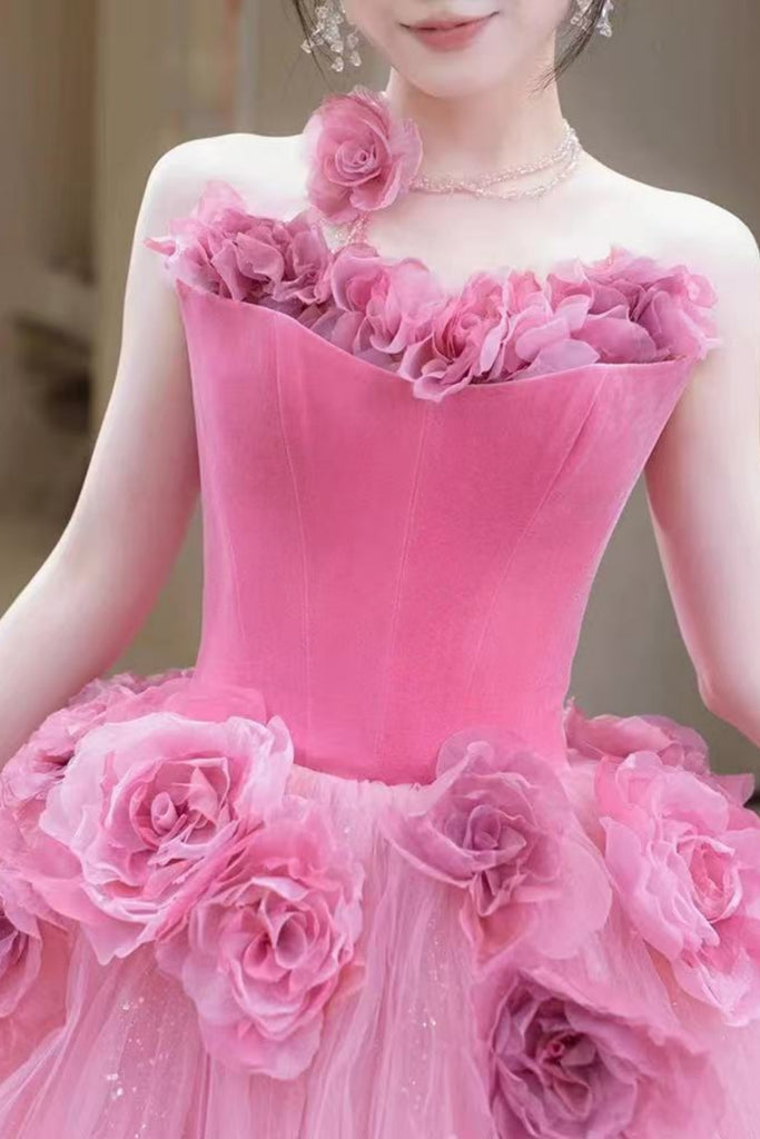 Pink Tulle Strapless Floral Long Prom Dresses with Velvet Top, Pink Formal Evening Dresses with 3D Flowers, Ball Gown WT1635