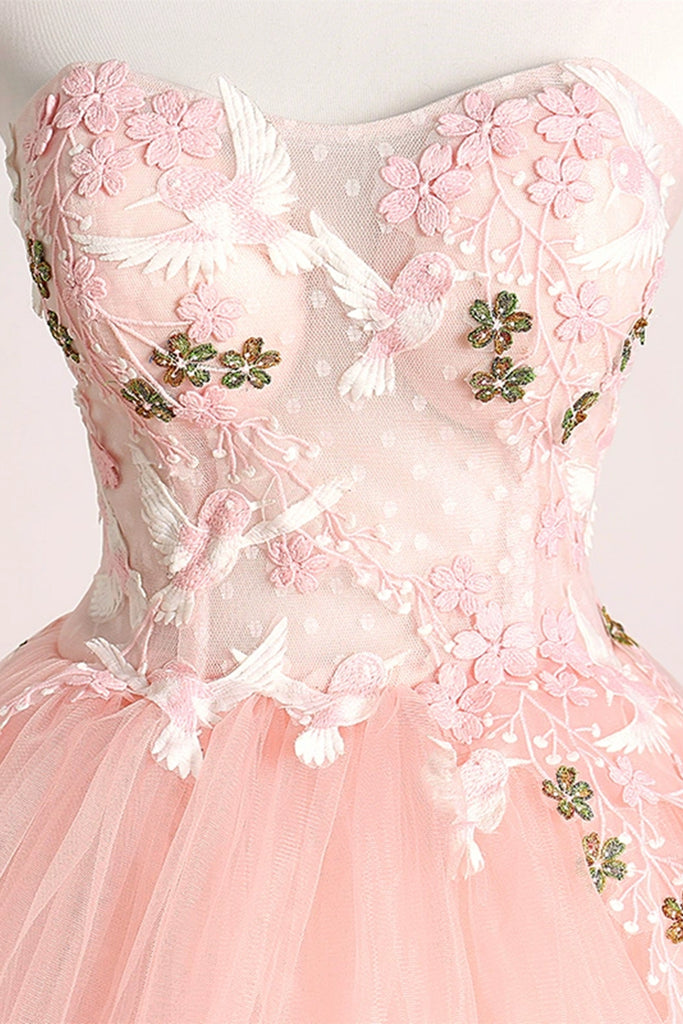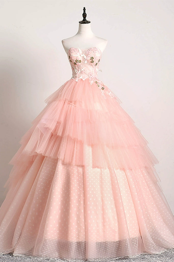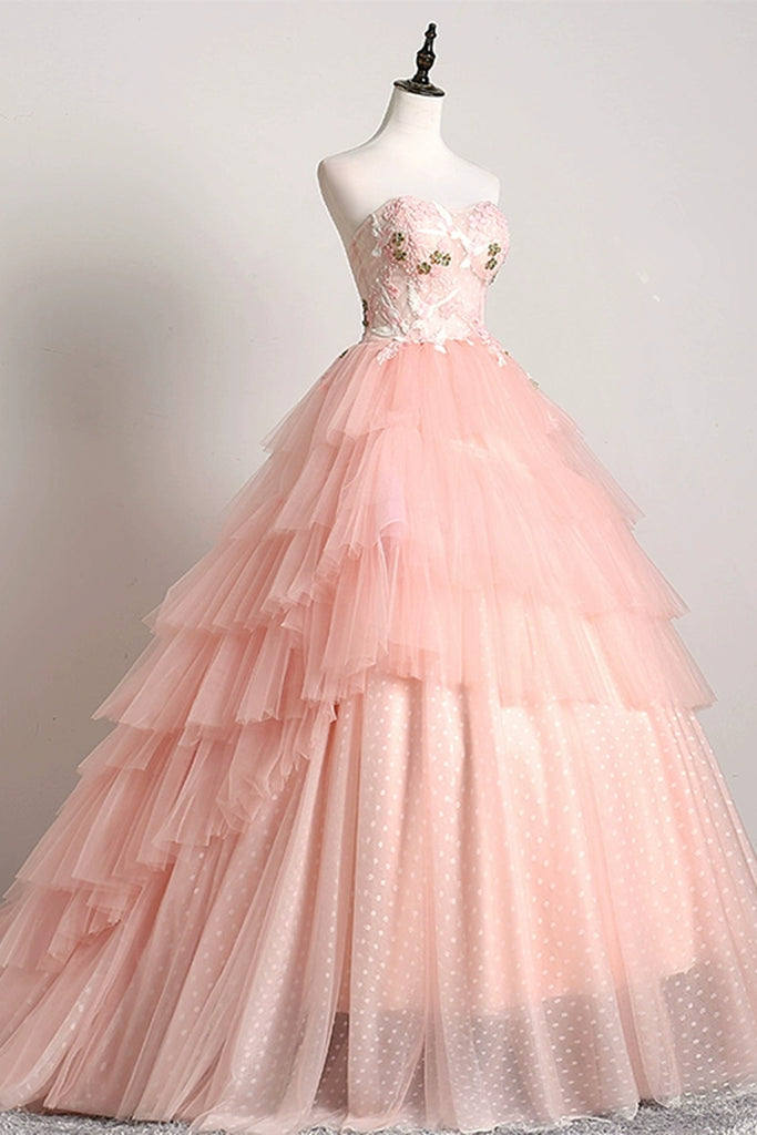 Pink Tulle Strapless Layered Floral Long Prom Dresses. Pink Tulle Formal Evening Dresses, Pink Ball Gown WT1186