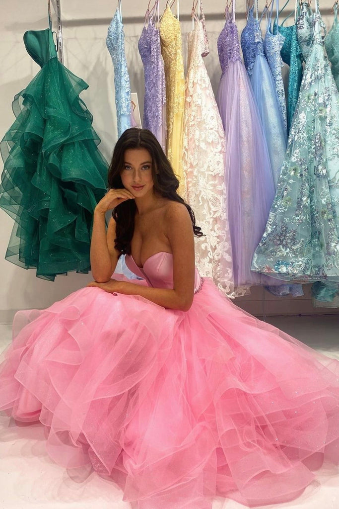 Pink Tulle Sweetheart Neck Strapless Long Prom Dresses with Belt, Strapless Pink Formal Evening Dresses WT1121