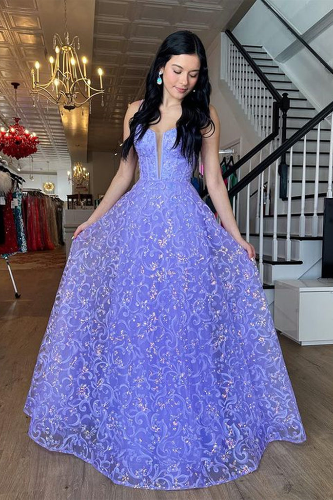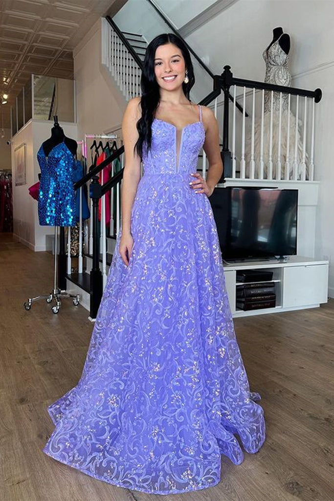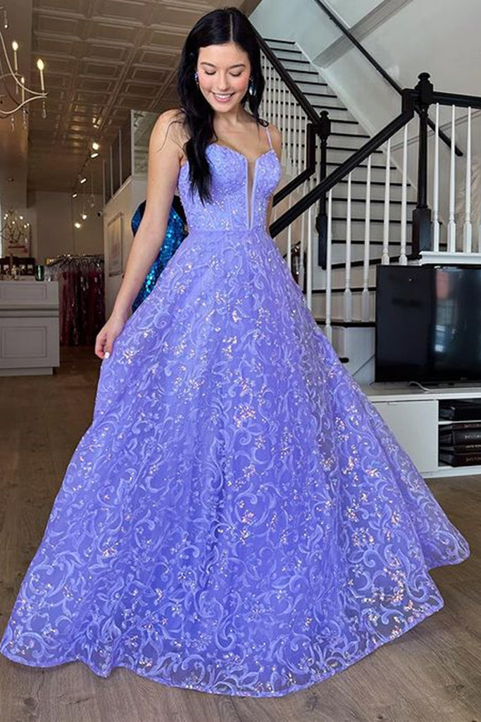 Purple Lace V Neck Open Back Long Prom Dresses, Purple Lace Formal Dresses, Purple Evening Dresses WT1095