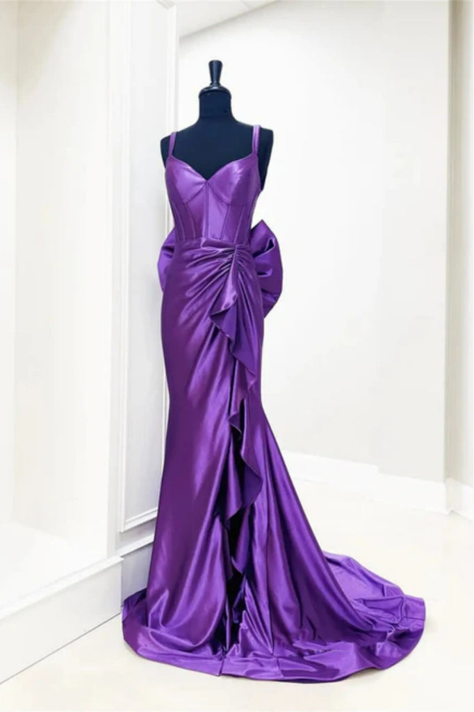 Purple Satin V Neck Open Back Mermaid Long Prom Dresses with Slit, Mermaid Purple Formal Graduation Evening Dresses WT1690