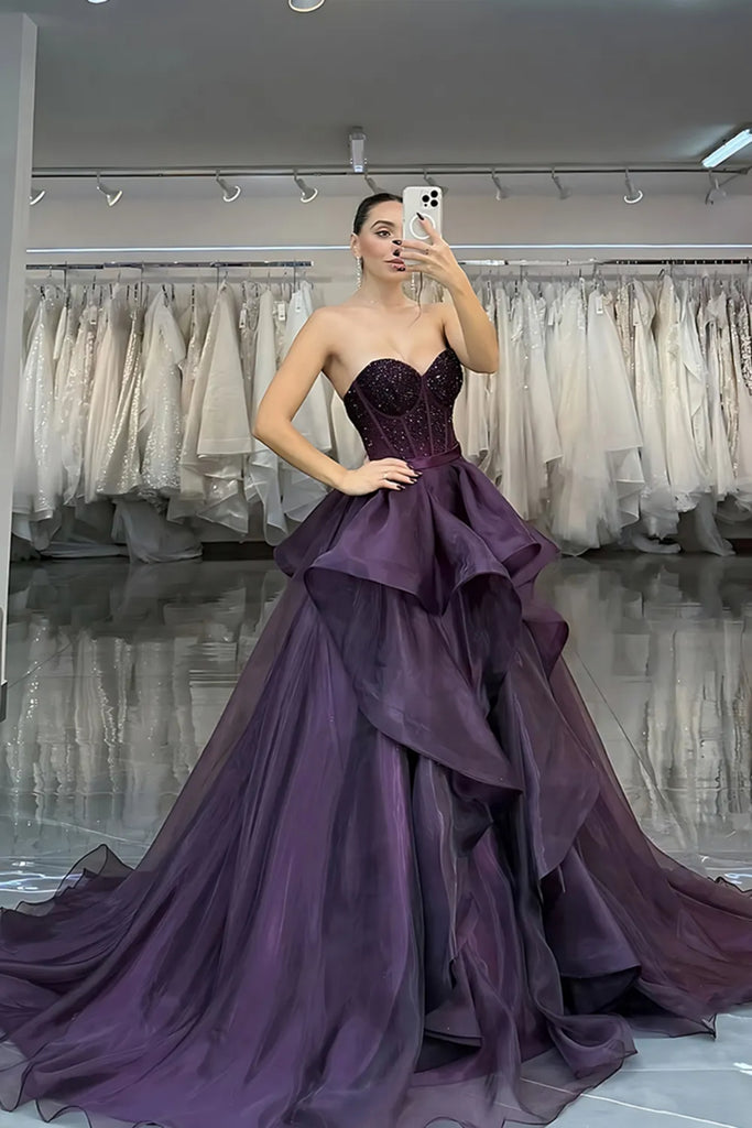 Purple Strapless Sweetheart Neck Beaded Long Prom Dresses, Purple Formal Evening Dresses, Ball Gown WT1687