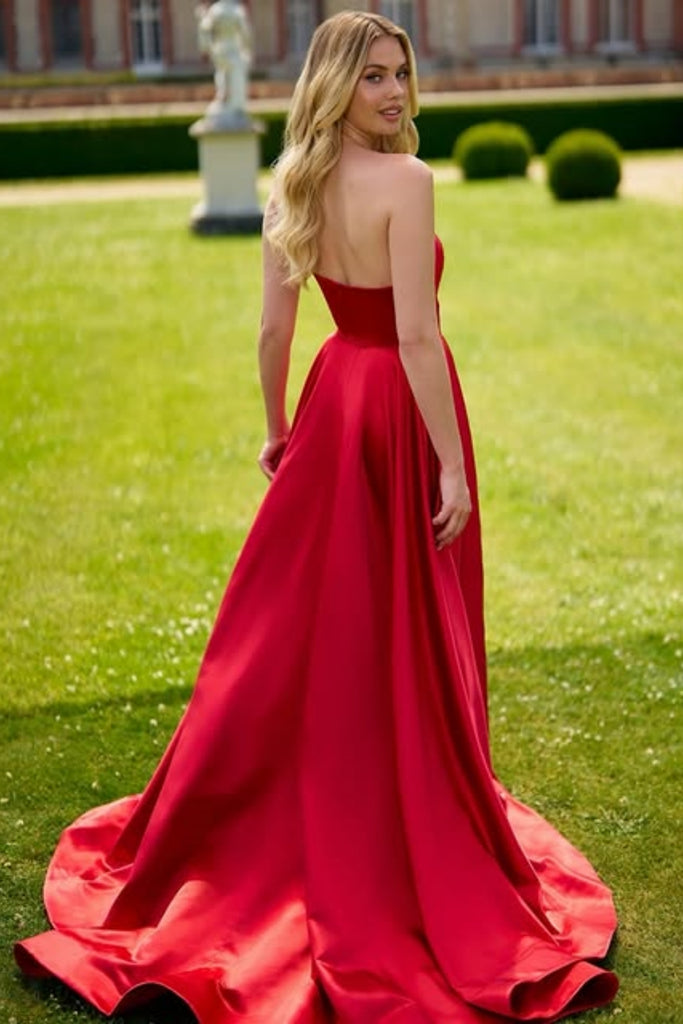 Red Satin Strapless Backless High Slit Long Prom Dresses, Long Red Formal Graduation Evening Dresses WT1594