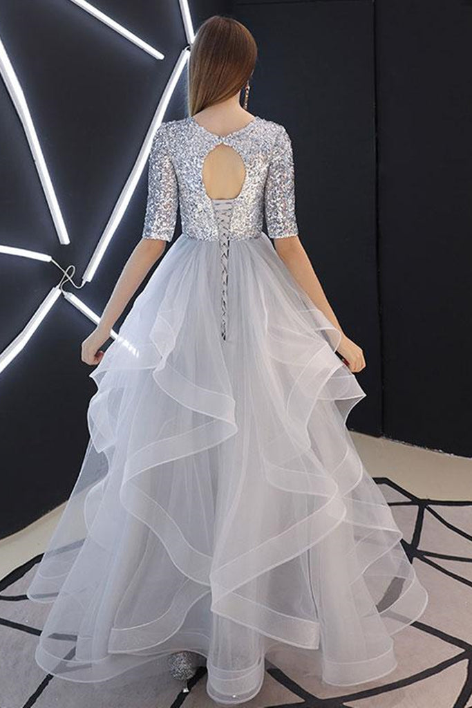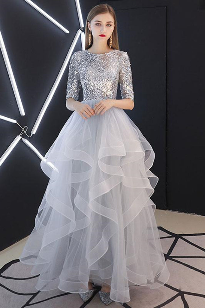 Round Neck Half Sleeves Silver Gray Long Prom Dresses, Silver Gray Sequins Formal Evening Dresses