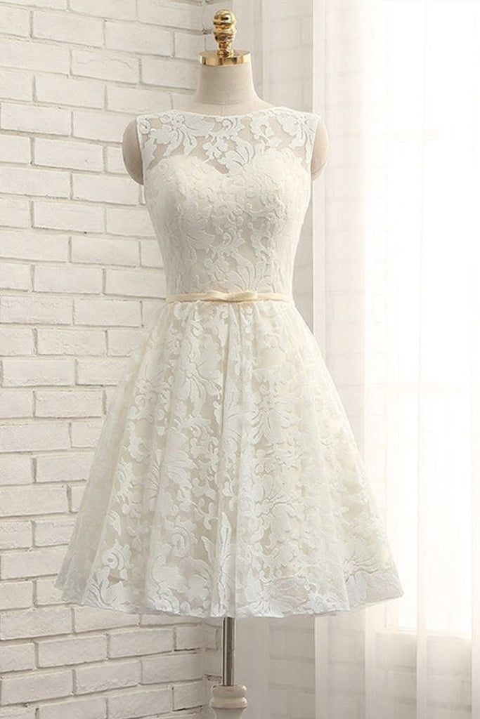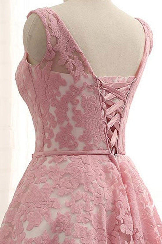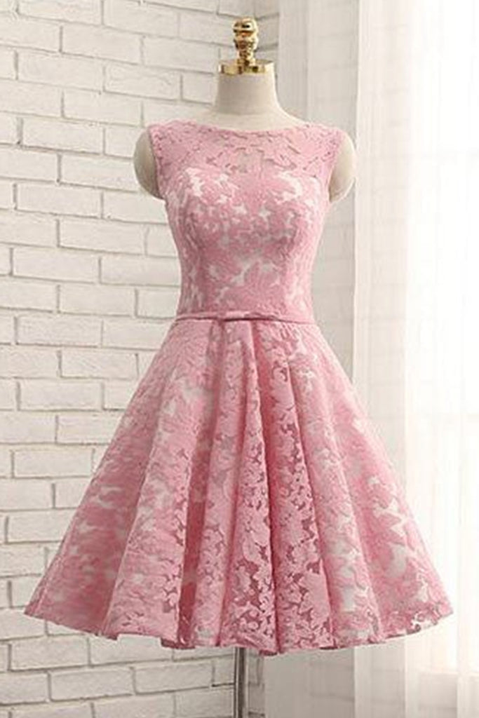 Round Neck Pink/White Lace Short Prom Homecoming Dresses, Pink/White Lace Formal Graduation Evening Dresses