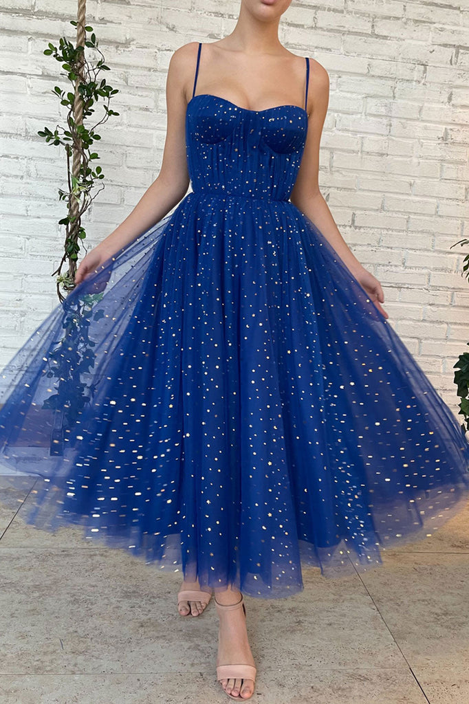 Royal Blue Tea Length Tulle Prom Dresses, Tea Length Royal Blue Formal Graduation Dresses