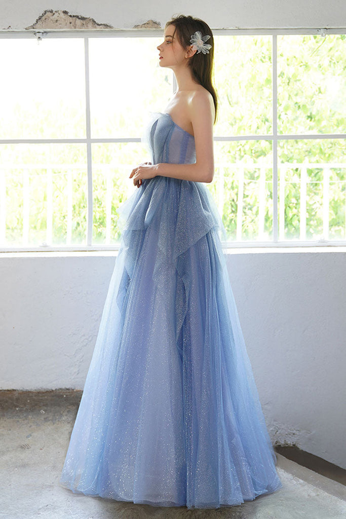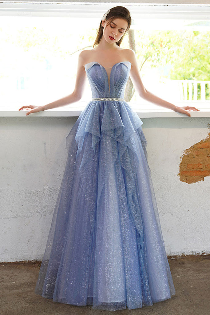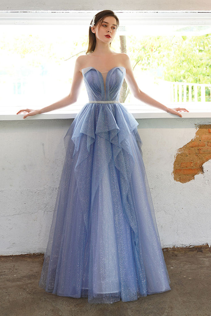 Shiny Blue Tulle V Neck Strapless Long Prom Dresses with Belt, Blue Tulle Formal Evening Dresses WT1045