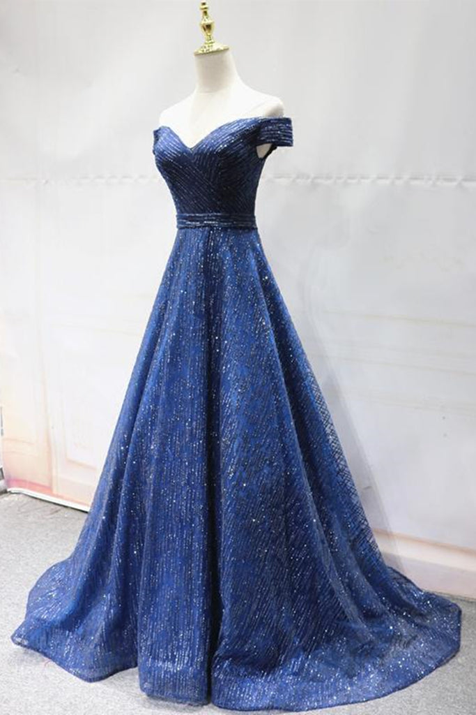 Shiny Off Shoulder Blue Long Prom Dresses, Long Blue Formal Evening Dresses