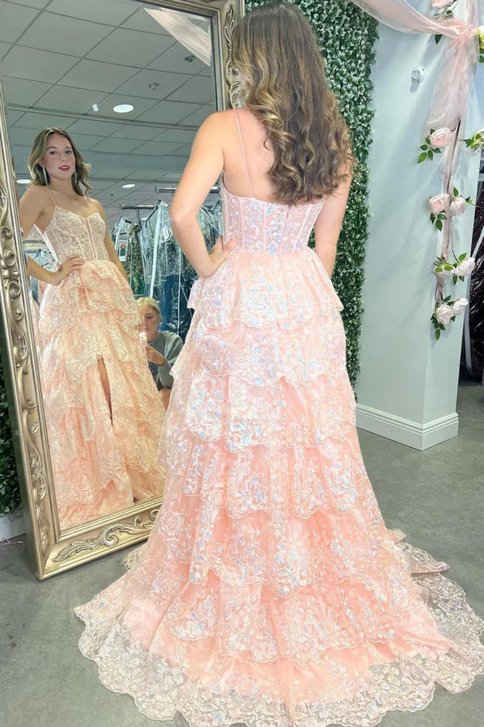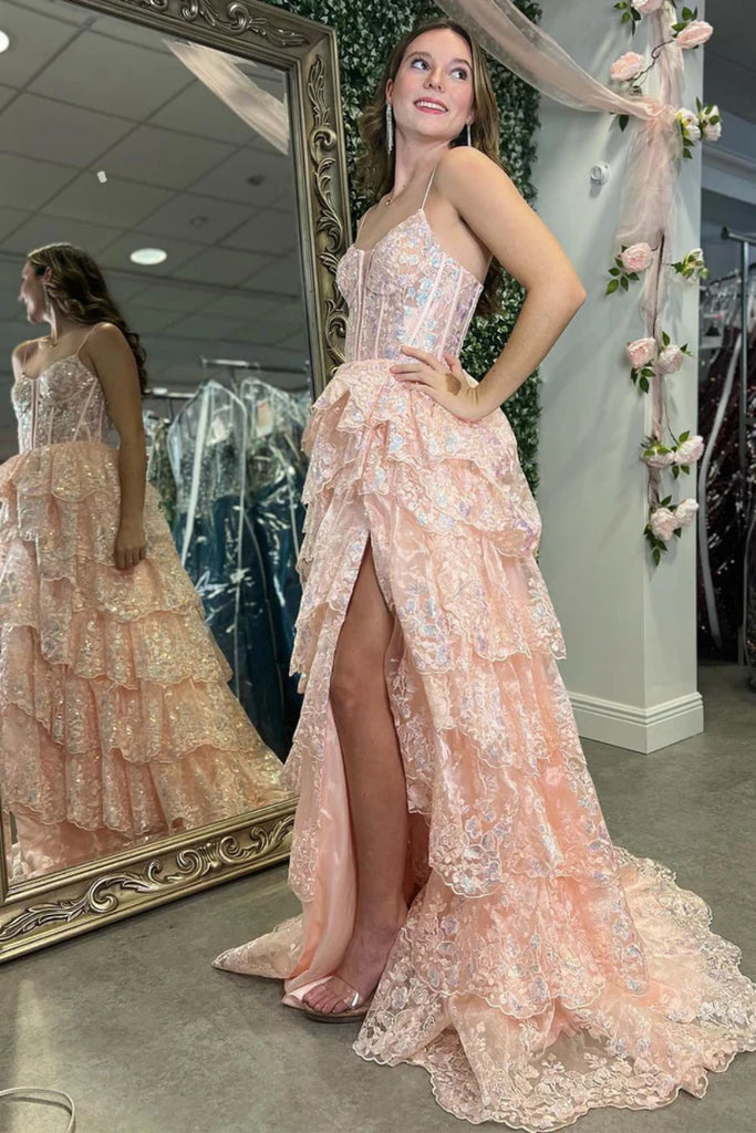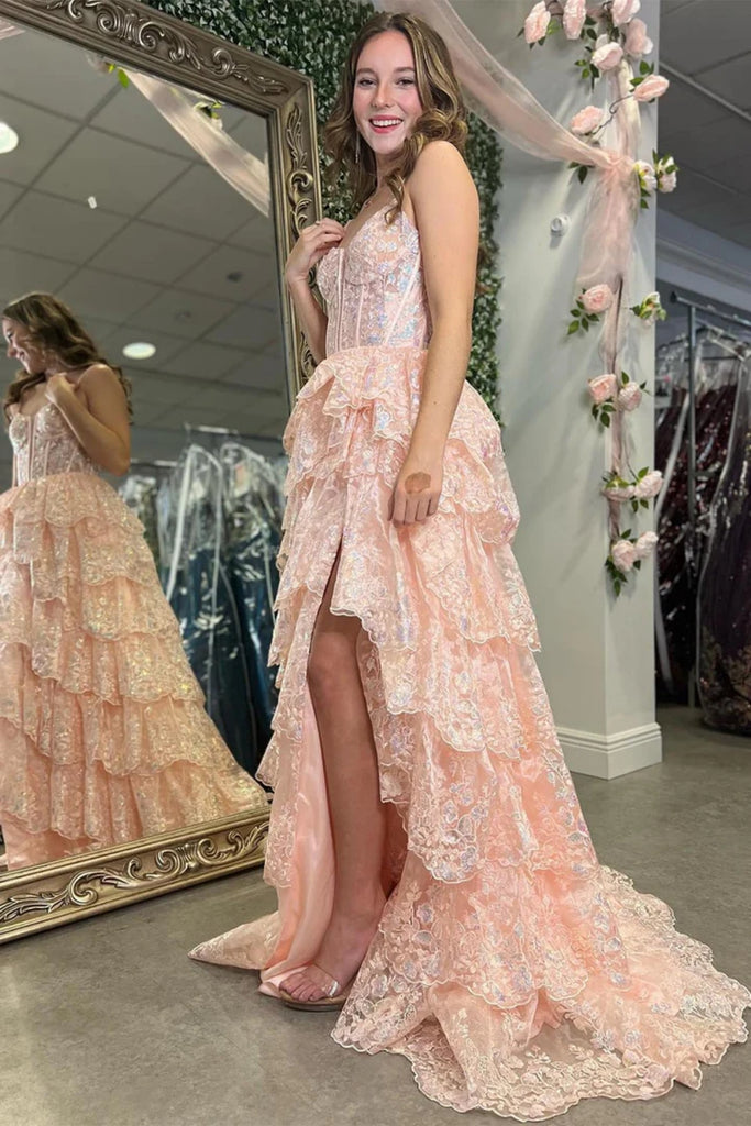 Shiny Pink A Line High Slit Layered Lace Long Prom Dresses, Pink Lace Formal Evening Dresses WT1583