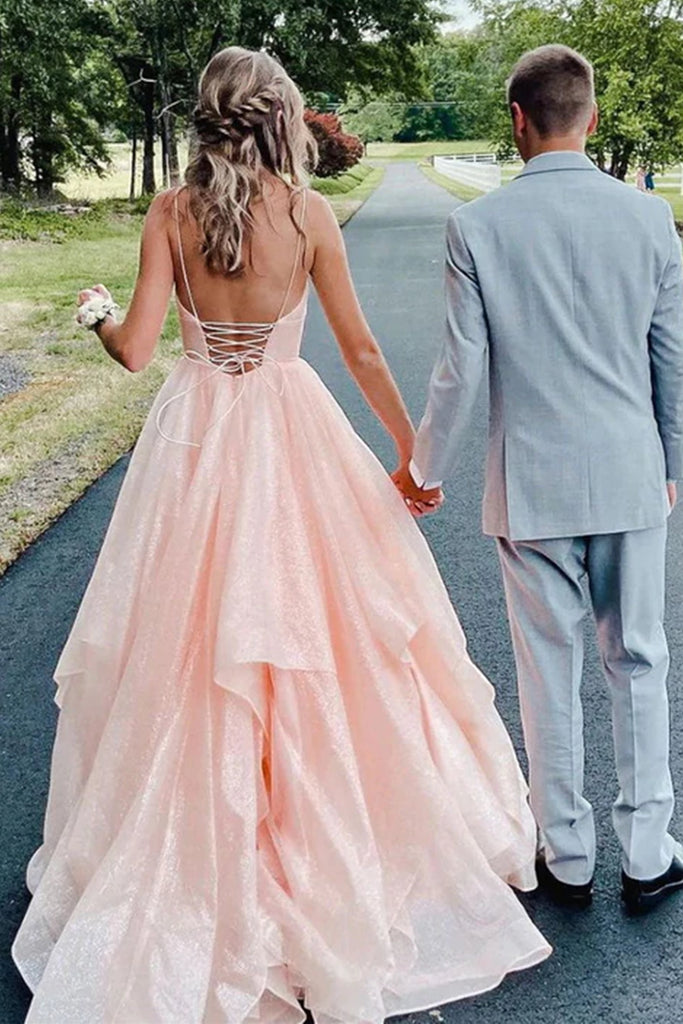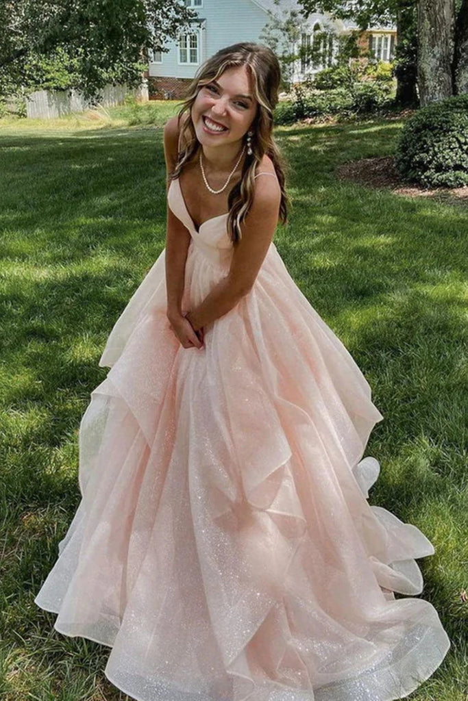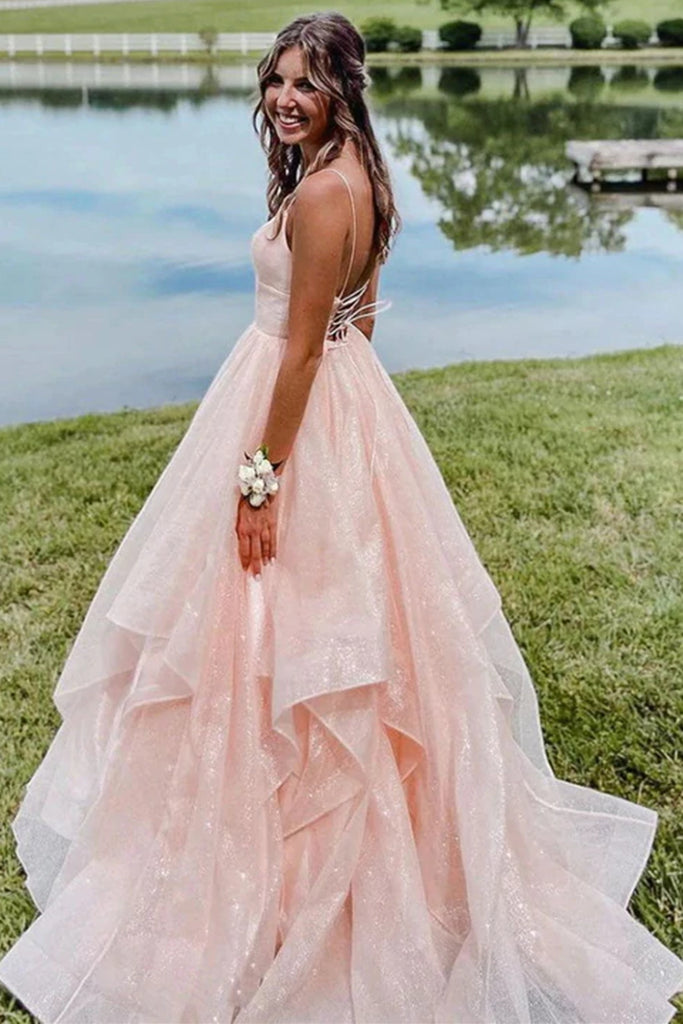 Shiny Pink Tulle Long Prom Dresses A Line V Neck Backless Formal Graduation Evening Dresses