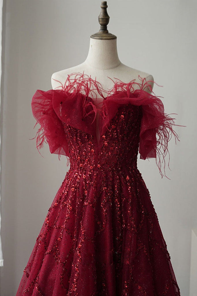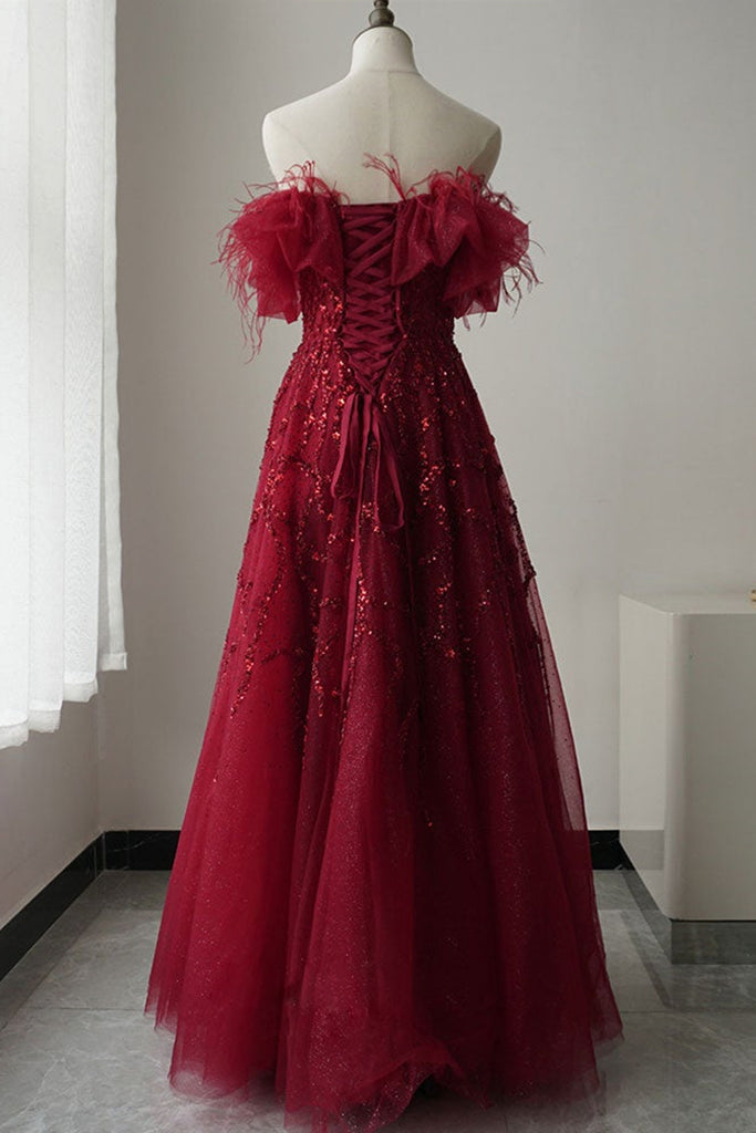Shiny Sequins Burgundy Tulle Long Prom Dresses, Burgundy Tulle Formal Graduation Evening Dresses