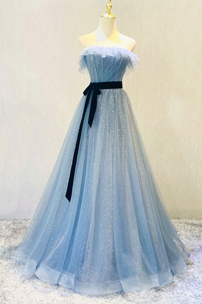 Shiny Sequins Tulle Blue Strapless Long Prom Dresses, Open Back Blue Formal Dresses, Blue Evening Dresses