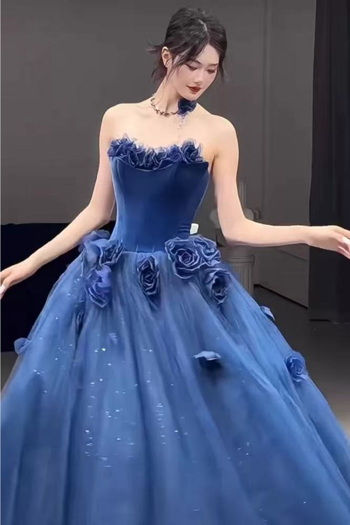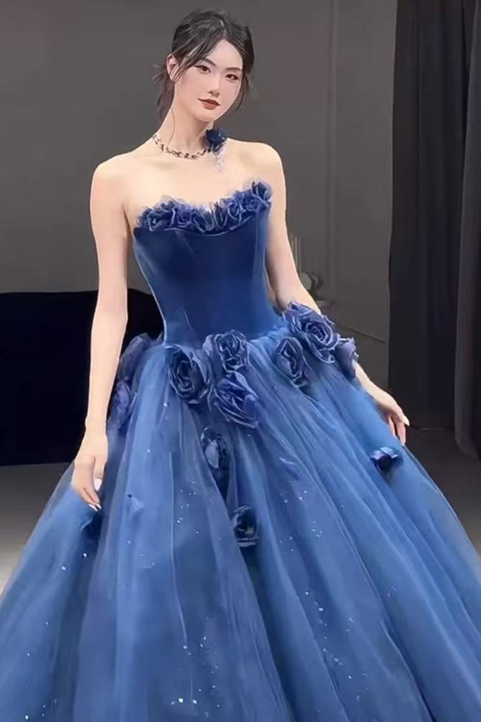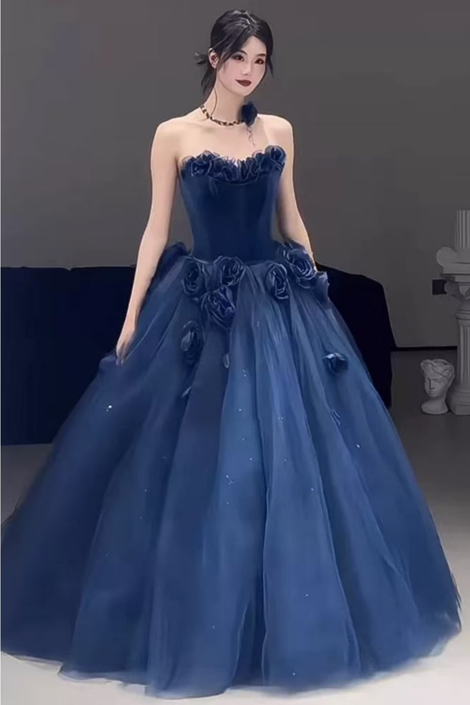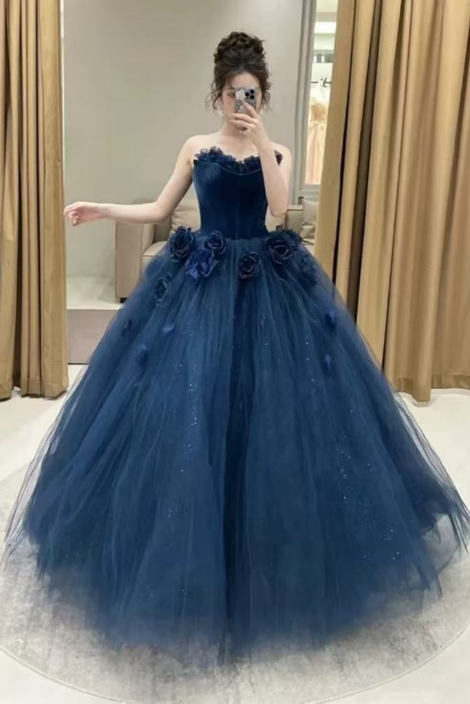 Shiny Strapless Navy Blue Tulle Long Prom Dresses with 3D Flowers, Navy Blue Formal Evening Dresses, Ball Gown