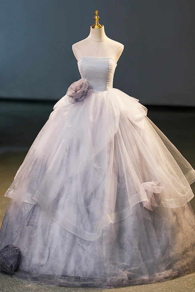 Shiny Tulle Gray Strapless Long Prom Dresses with Flowers, Gray Tulle Formal Evening Dresses, Ball Gown WT1588
