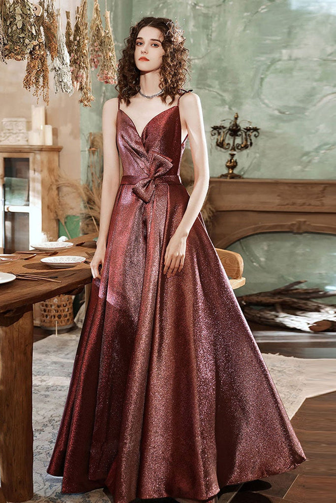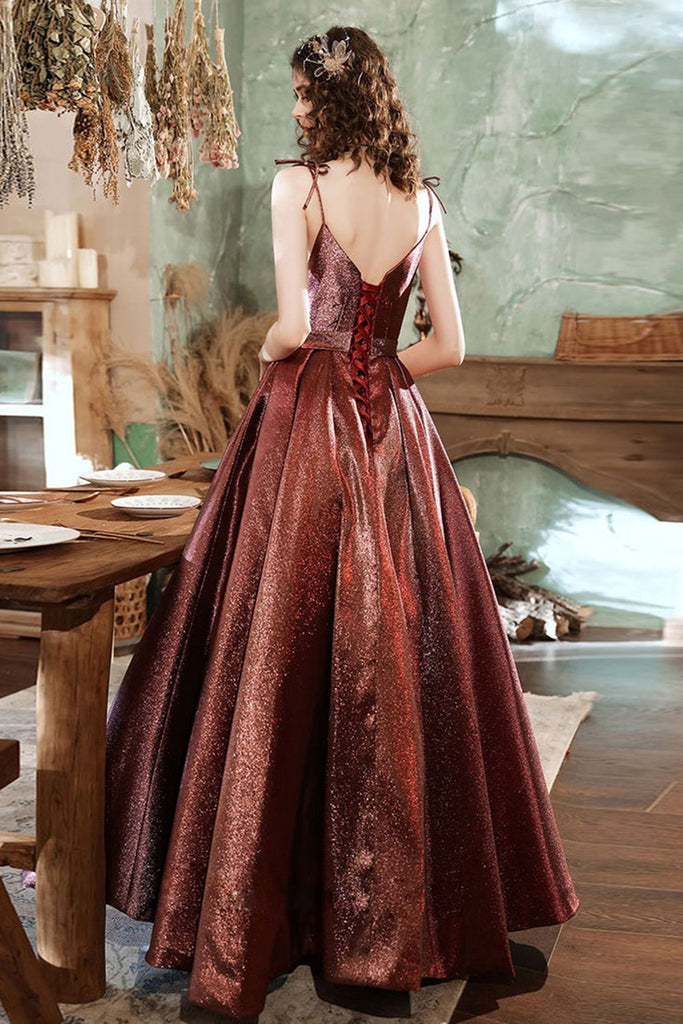 Shiny V Neck Maroon Long Prom Dresses, Open Back Maroon Formal Dresses, Maroon Evening Dresses