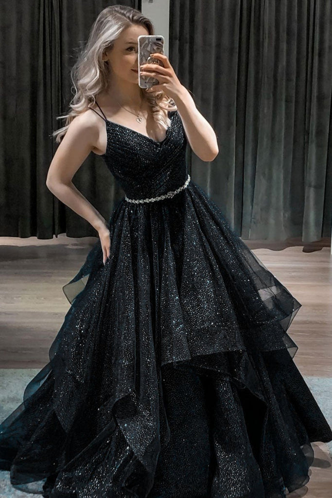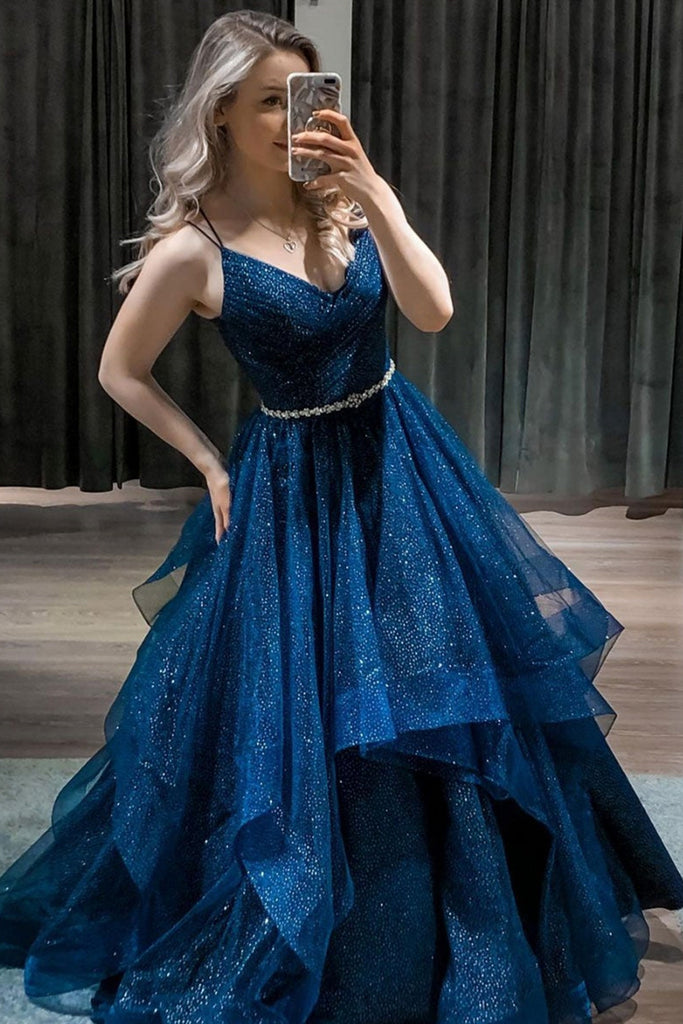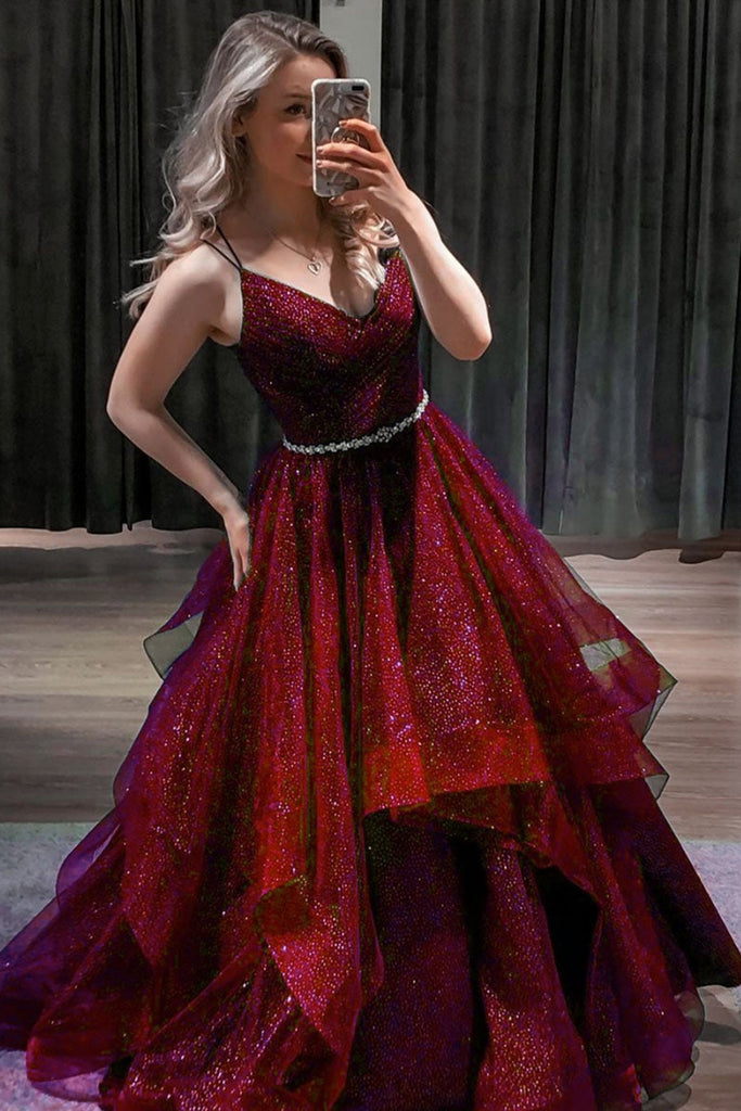 Shiny V Neck Puffy Dark Blue Burgundy Black Long Prom Dresses with Belt, V Neck Dark Blue Burgundy Black Formal Evening Dresses
