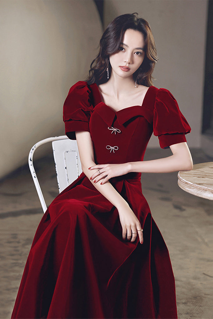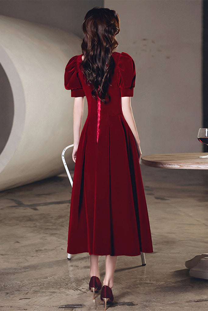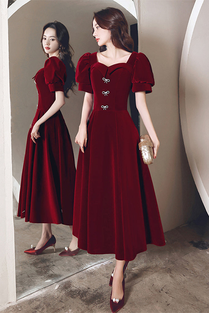 Short Sleeves Burgundy Velvet Tea Length Prom Homecoming Dresses, Burgundy Velvet Formal Graduation Evening Dresses