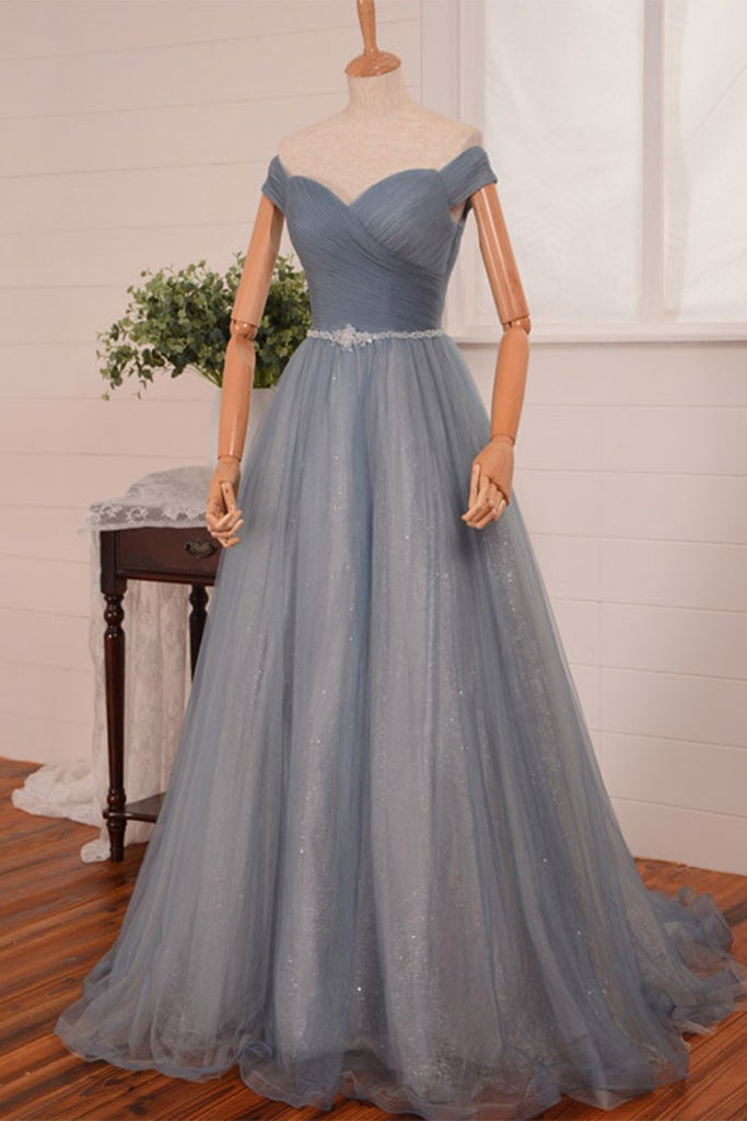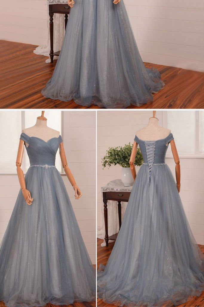 Simple Off Shoulder Gray Tulle Long Prom Dresses with Belt, Off the Shoulder Gray Formal Evening Dresses