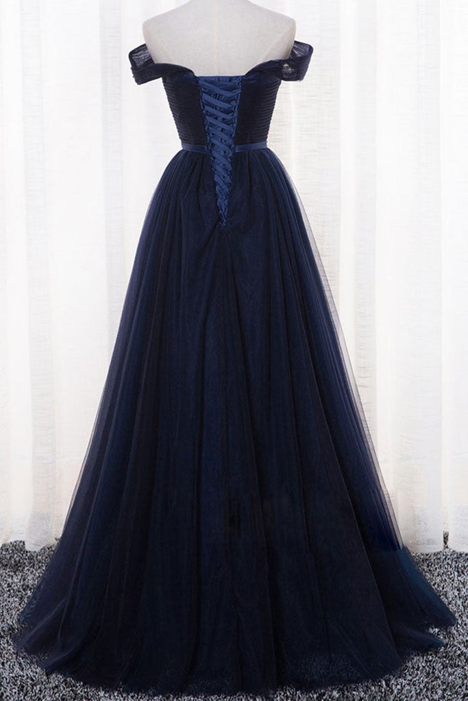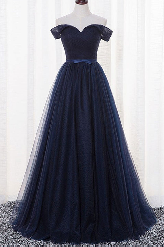 Simple Off Shoulder Navy Blue Tulle Long Prom Dresses, Off the Shoulder Navy Blue Formal Dresses, Navy Blue Evening Dresses