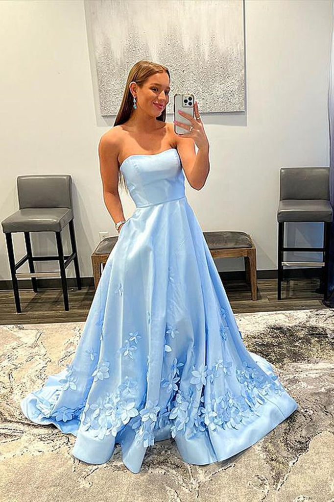 Strapless Light Blue Floral Long Prom Dresses, 3D Flower Long Formal Graduation Dresses
